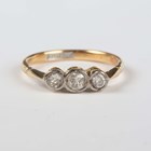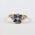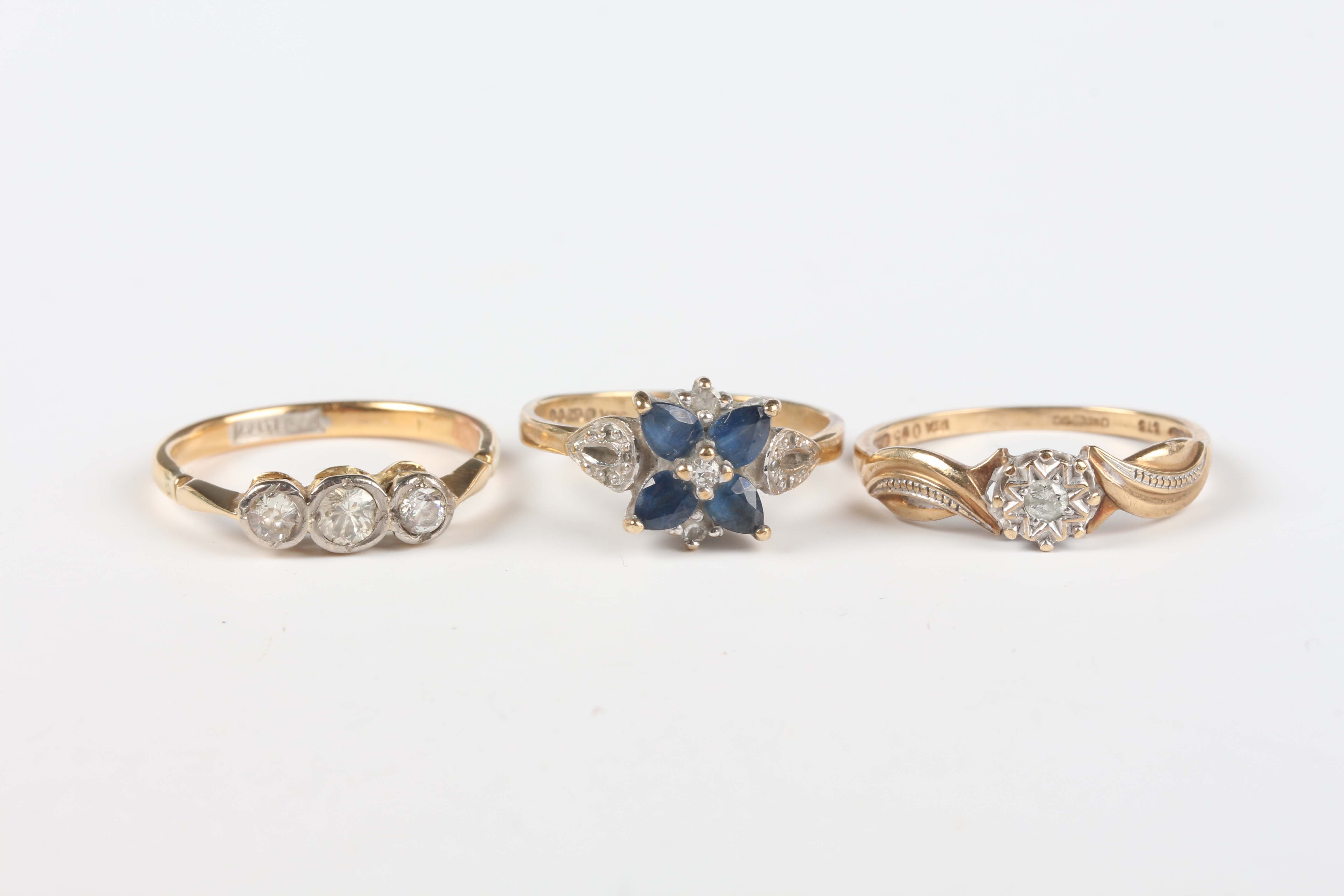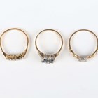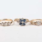 A gold ring, collet set with two diamonds and a colourless gemstone, unmarked, weight 2.6g, ring size approx M1/2 (re-shanked), a 9ct gold, sapphire and diamond ring, mounted with a circular cut diamond within a surround of four marquise shaped sapphires, and a 9ct gold and diamond single stone ring, total weight 4.2g, with three cases.