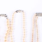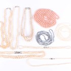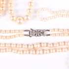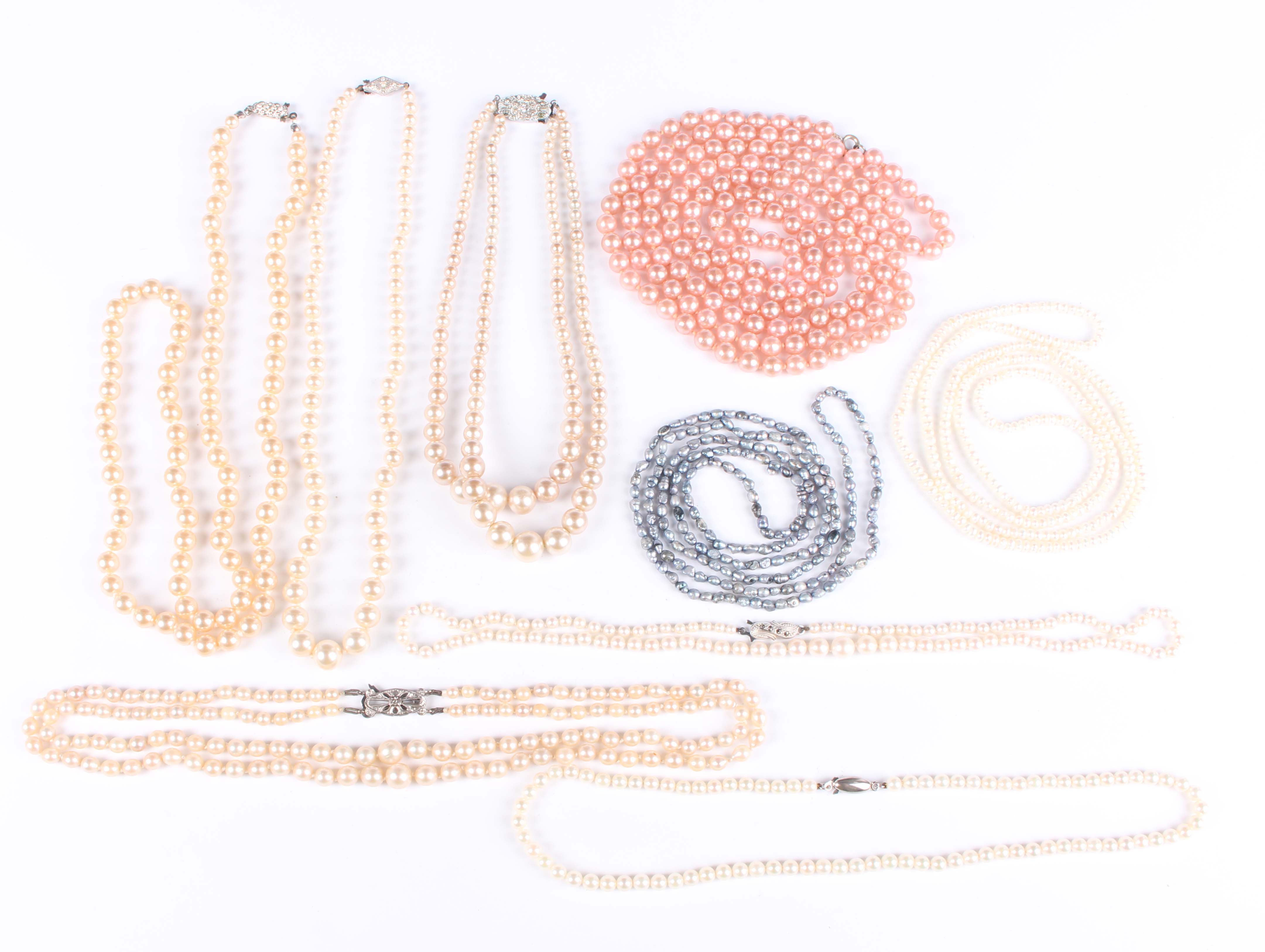 A two row necklace of graduated cultured pearls on a white gold and diamond single stone clasp, length of shortest strand 40cm, two further single row necklaces of cultured pearls and a group of mostly imitation pearl necklaces, with a case.