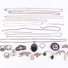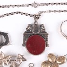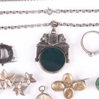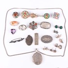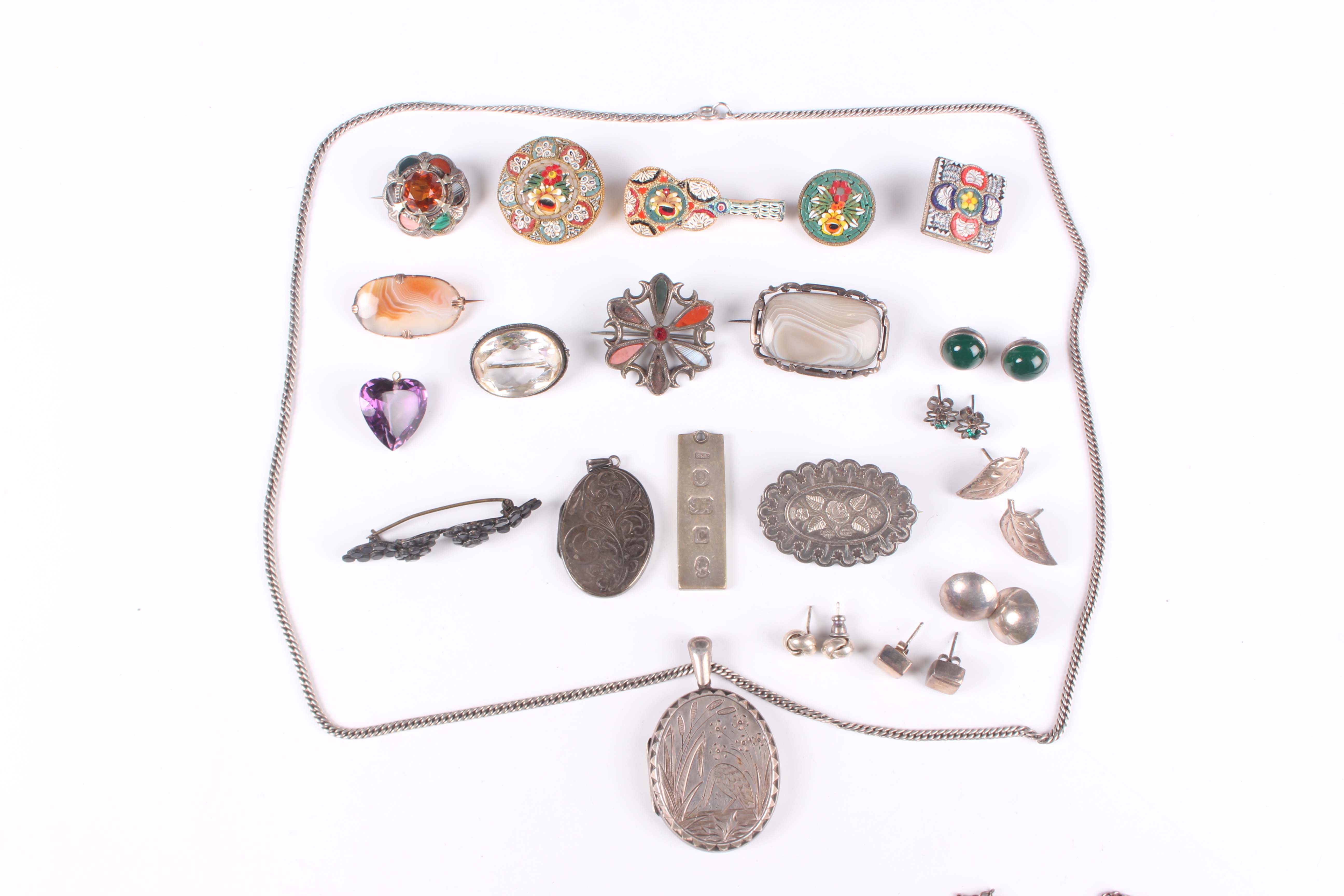 A group of mostly silver and silver mounted jewellery, including an Aesthetic Movement oval locket with a heron motif, unmarked, an oval pendant locket, six pairs of earrings, various gem set brooches, four rings and four gilt metal and micromosaic brooches.