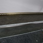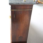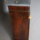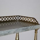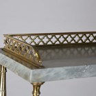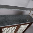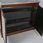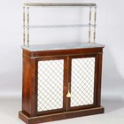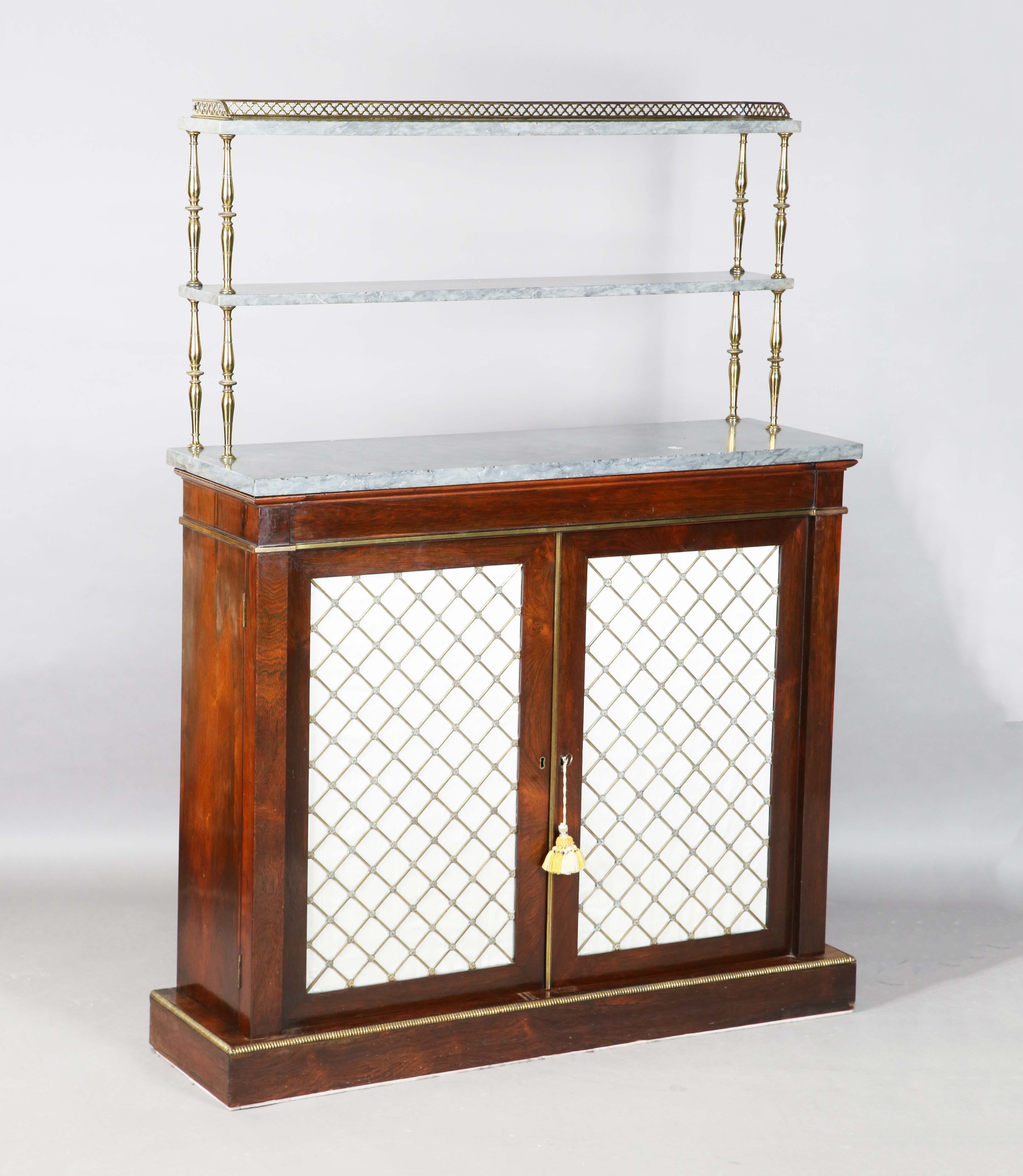 A Regency rosewood chiffonier, fitted with a three-tier grey marble gallery and gilt metal supports, the base fitted with a pair of doors inset with gilt metal lattice grills and fabric panels, raised on a plinth base with brass beaded borders, height 147cm, width 107cm, depth 33cm.