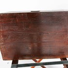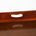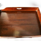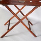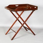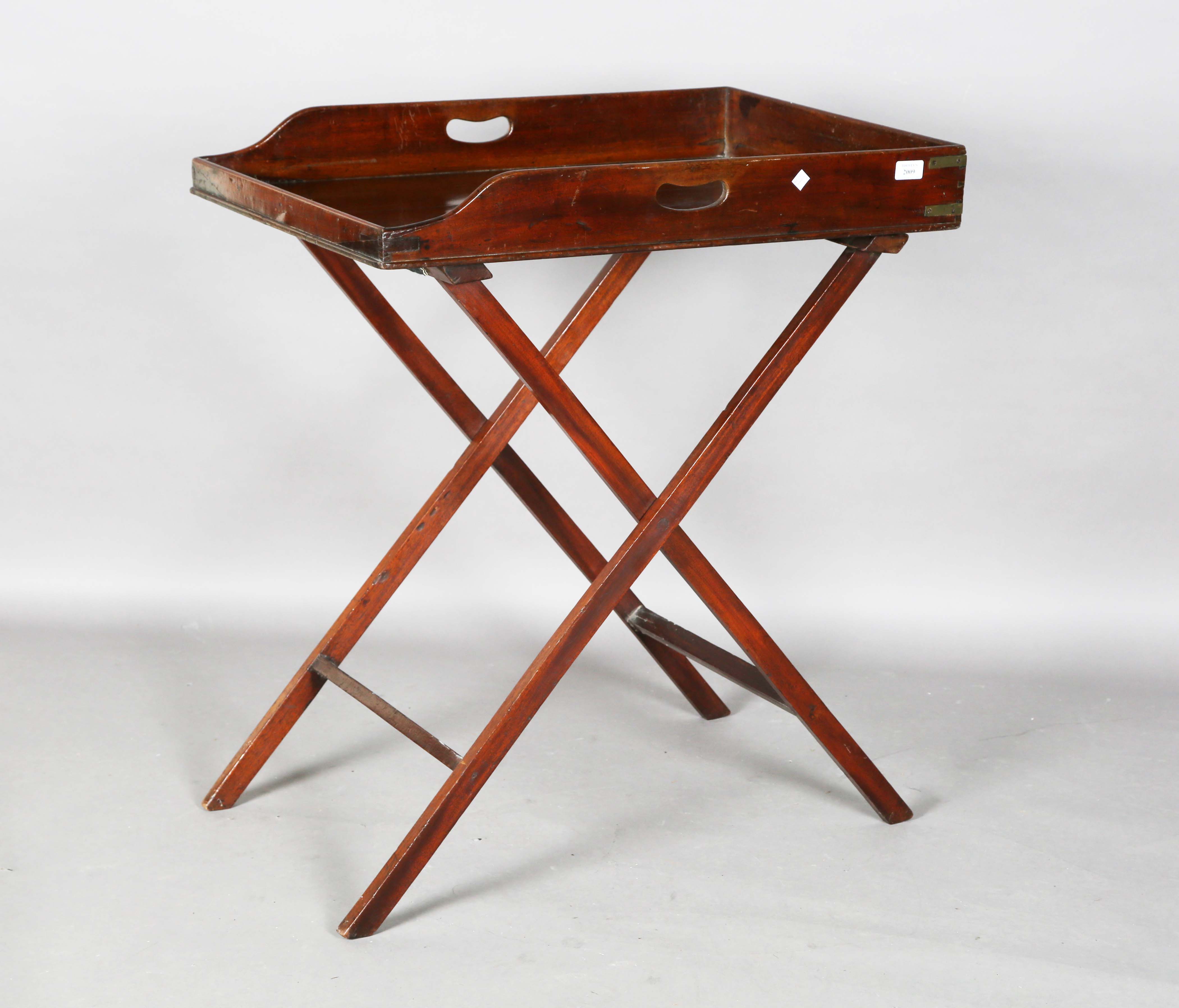 A 19th century mahogany butler's tray with two brass bound corners and pierced handles, raised on a period folding stand, height 87cm, width 75cm, depth 52cm.