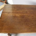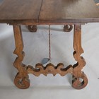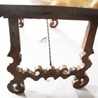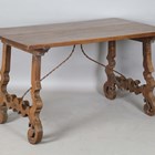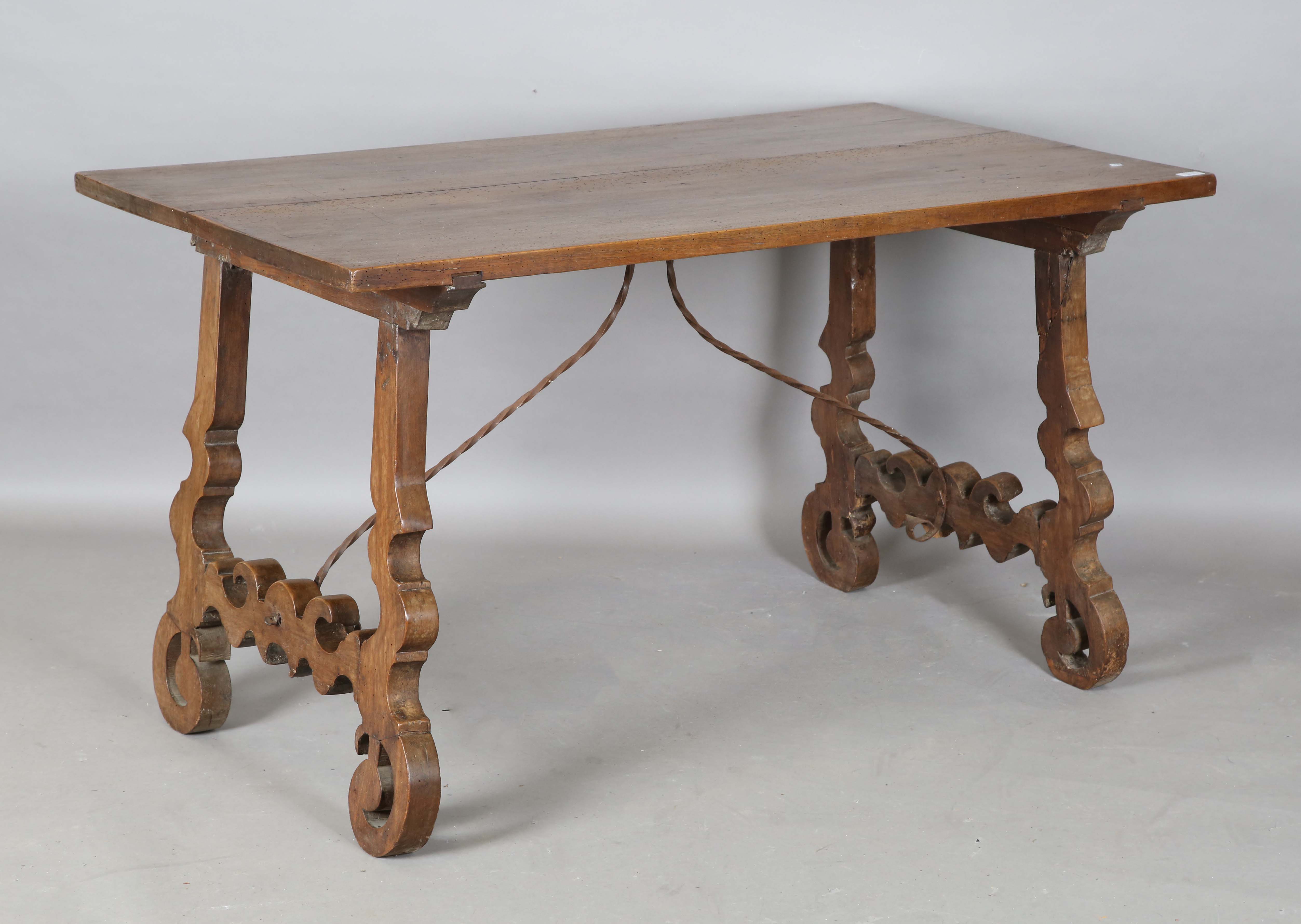 A 19th century Spanish walnut refectory table, the thick two-piece top on shaped trestle supports united by a wrought iron stretcher, height 78cm, length 137cm, depth 79cm.