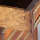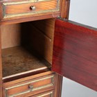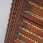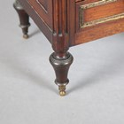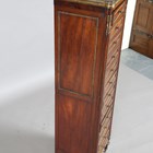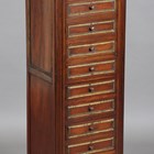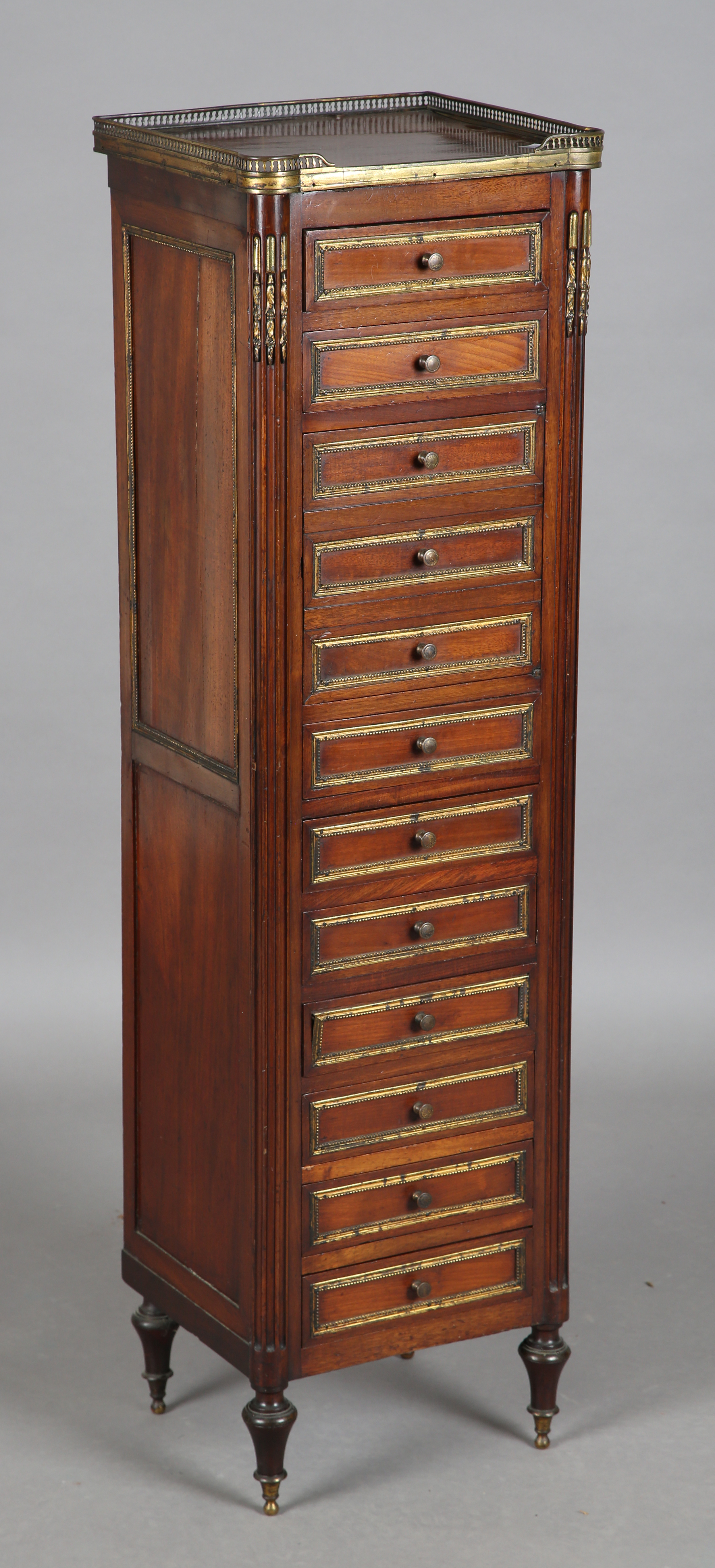 An early 20th century French Louis XVI style mahogany narrow chest of twelve drawers, with gilt metal mounts and galleried top, on turned baluster legs, height 114cm, width 33cm, depth 28cm.