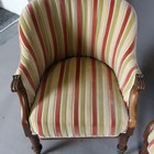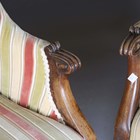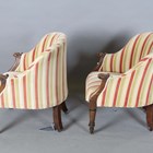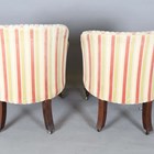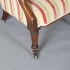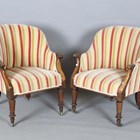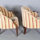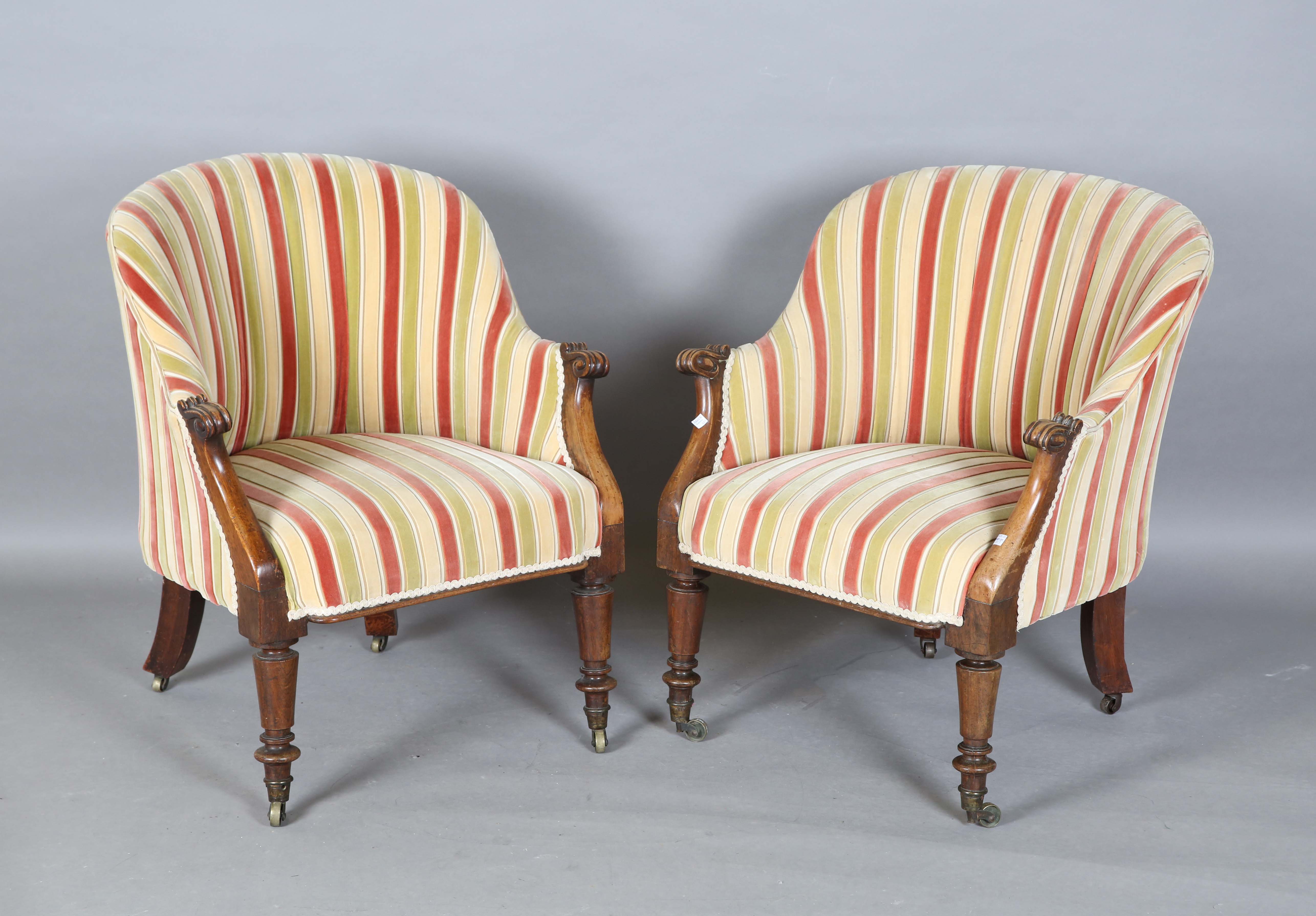 A pair of early Victorian mahogany tub back armchairs, upholstered in striped cut velour, on turned legs and castors, height 77cm, width 62cm, depth 68cm.