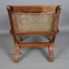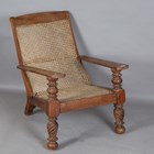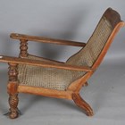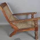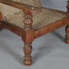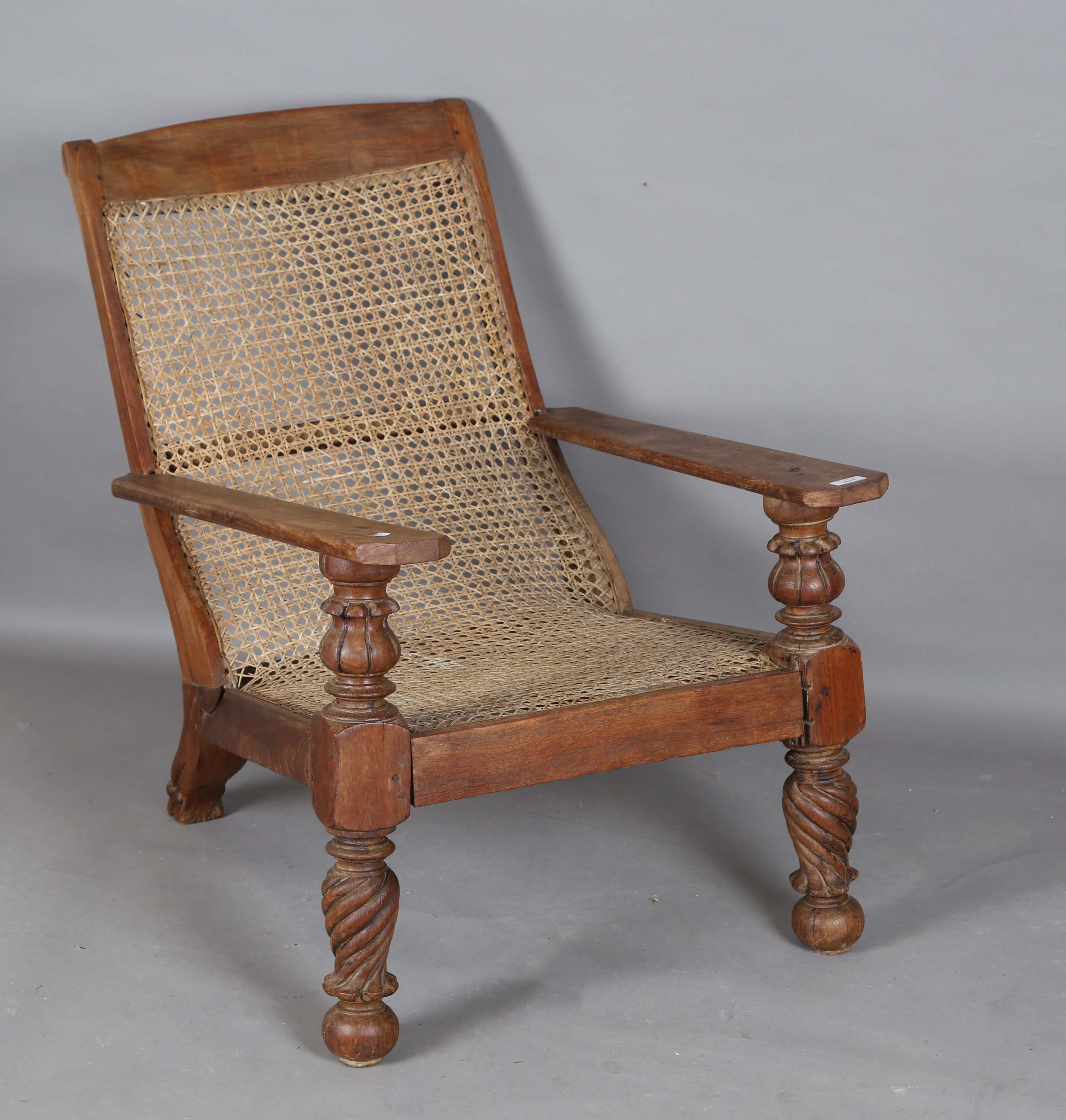 An early 19th century Colonial hardwood plantation chair, the caned seat and back above carved and spiral reeded legs, height 90cm, width 66cm, length 103cm (faults).