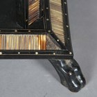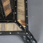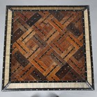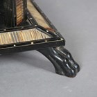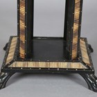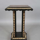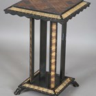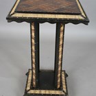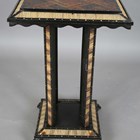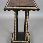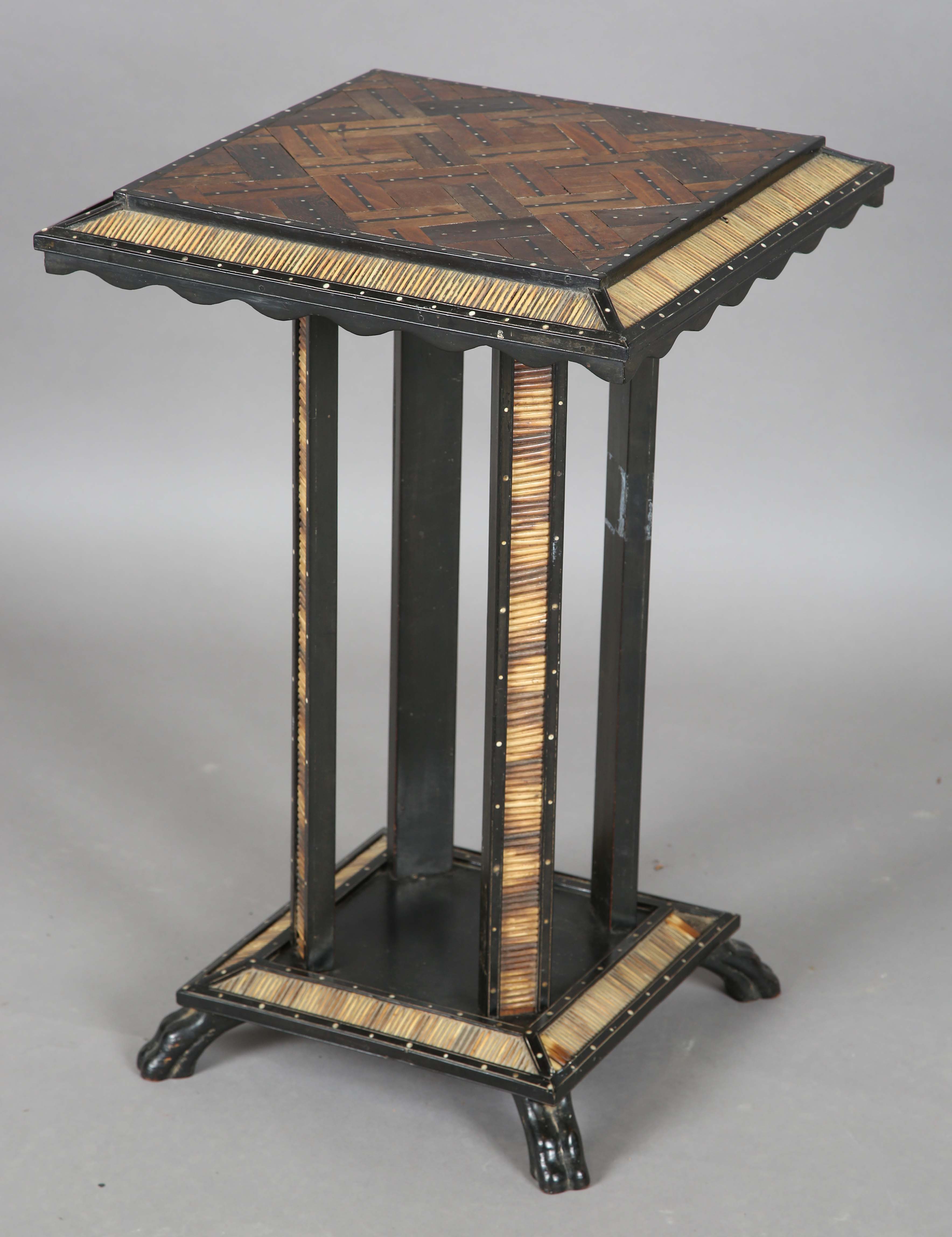 A 19th century Ceylonese ebony and specimen wood two-tier table, the top with a parquetry pattern of various woods within a border of porcupine quills, raised on a quill inset base, height 63cm, width 41cm.