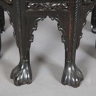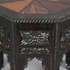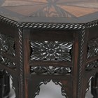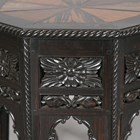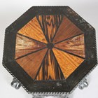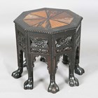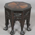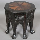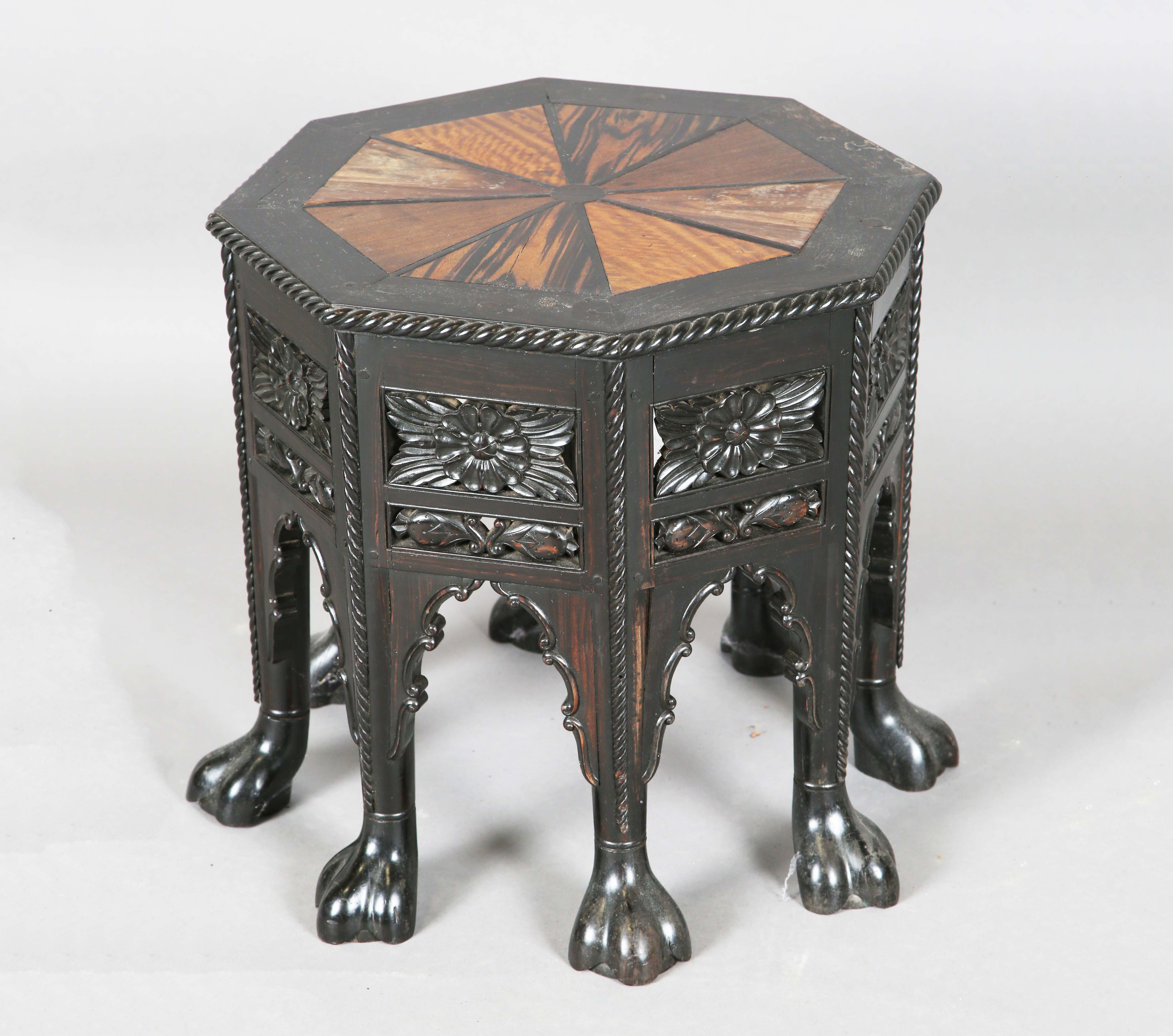 A 19th century Ceylonese coromandel octagonal occasional table, the top veneered with segments of various woods above a carved and pierced frieze, on claw feet, height 41cm, width 44.5cm.