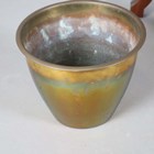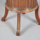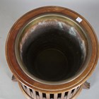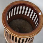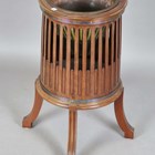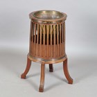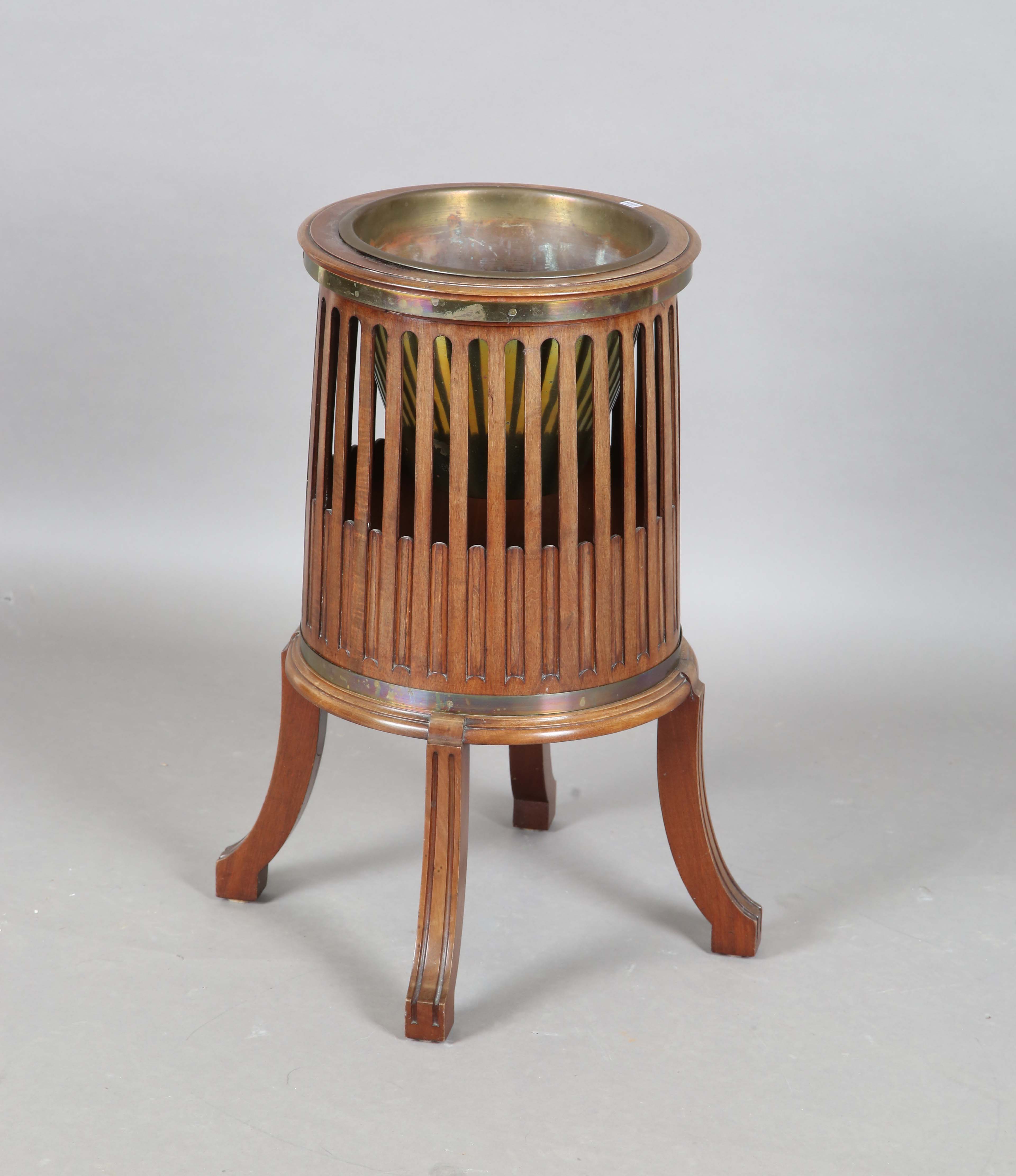 An early 20th century Regency style mahogany jardinière of cylindrical slatted form, the top with a moulded edge and fitted with a brass pot, raised on three sabre legs with fluted decoration, height 62cm, diameter 33cm.