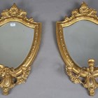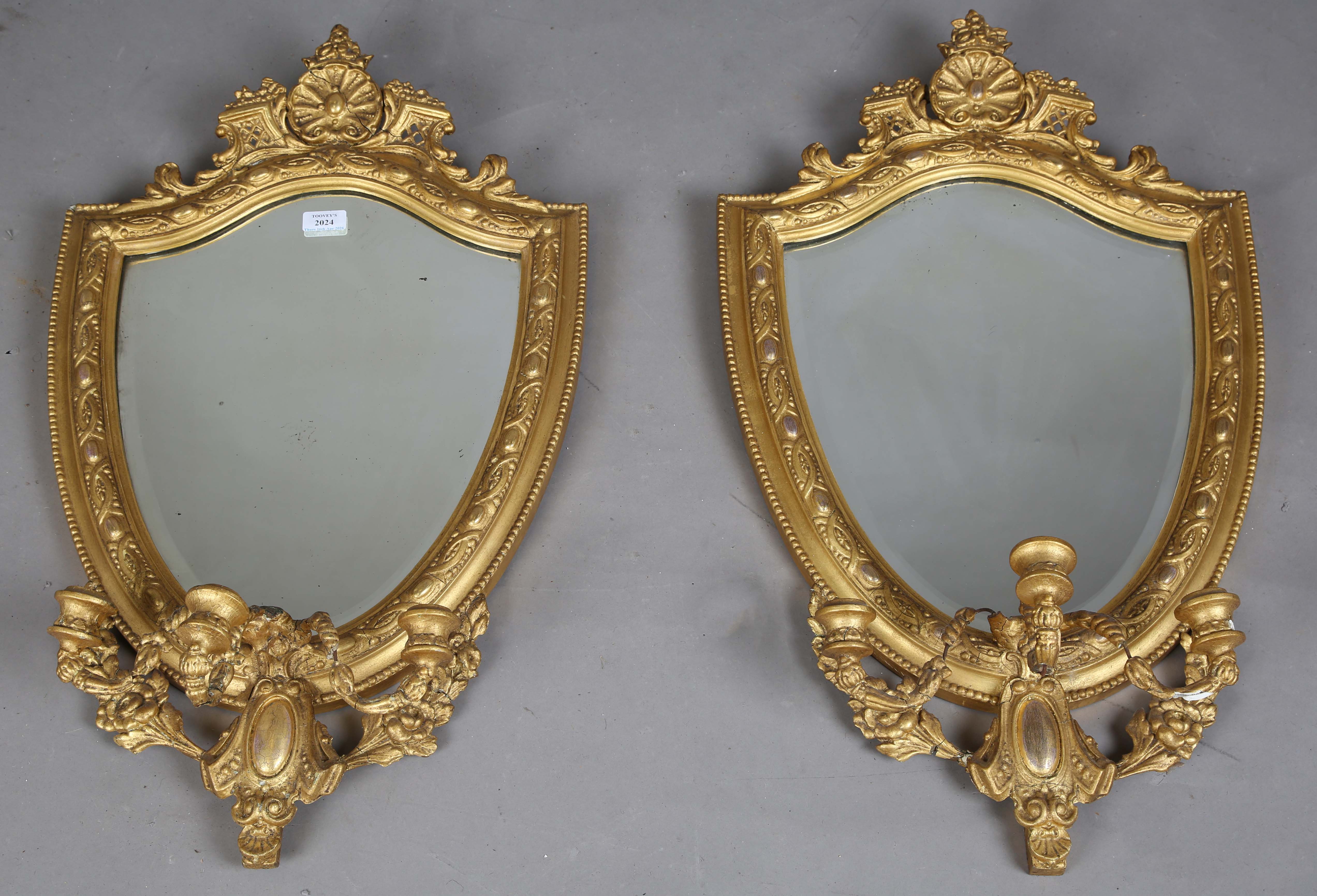 A pair of mid-Victorian gilt composition girandole wall mirrors of shield form, height 80cm, width 47cm (some minor faults).