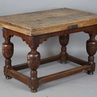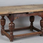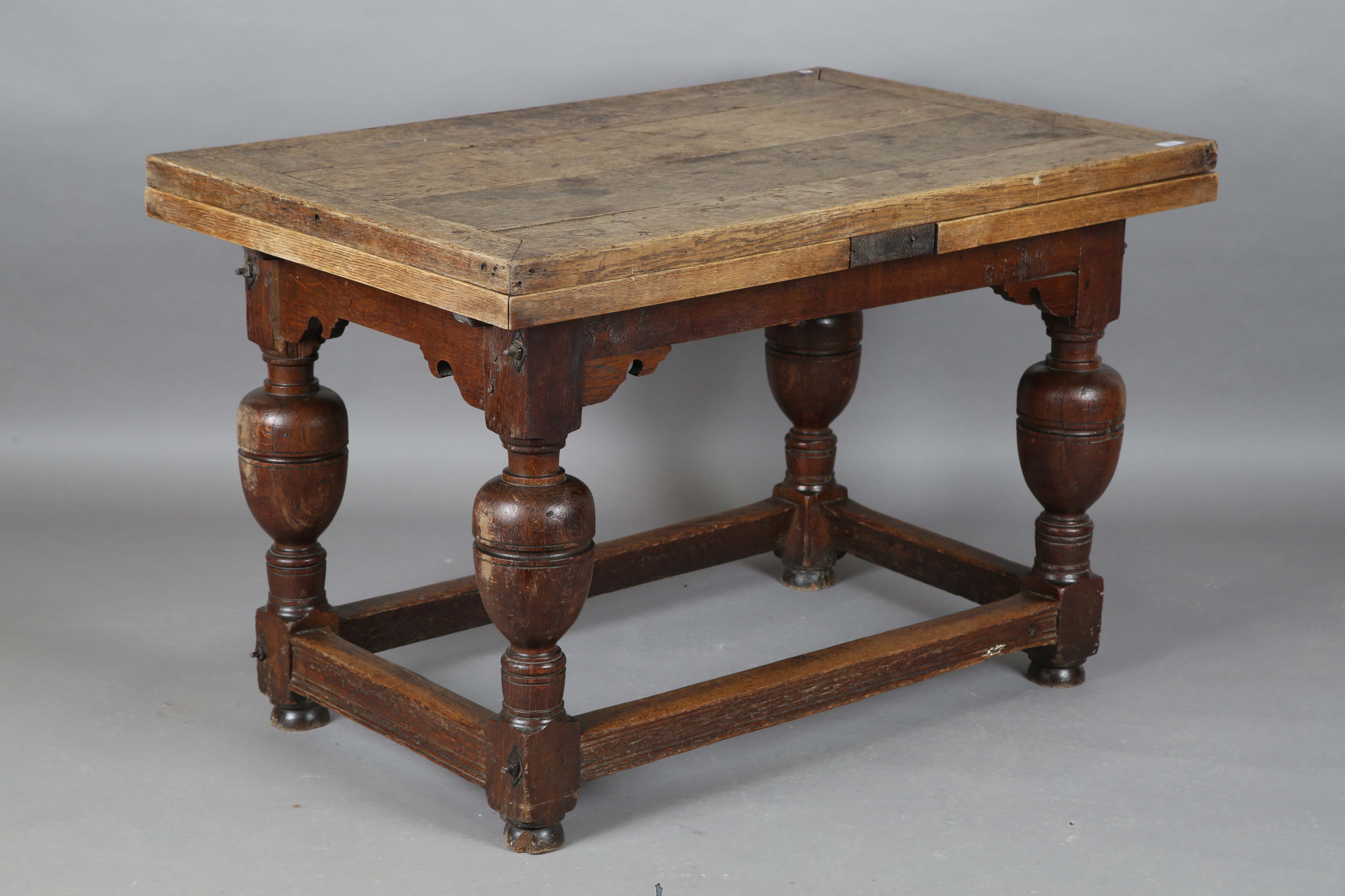 A 17th century and later oak drawleaf refectory table, raised on cup and cover legs united by moulded block stretchers, height 77cm, unextended length 119cm, extended length 223cm, depth 78cm.