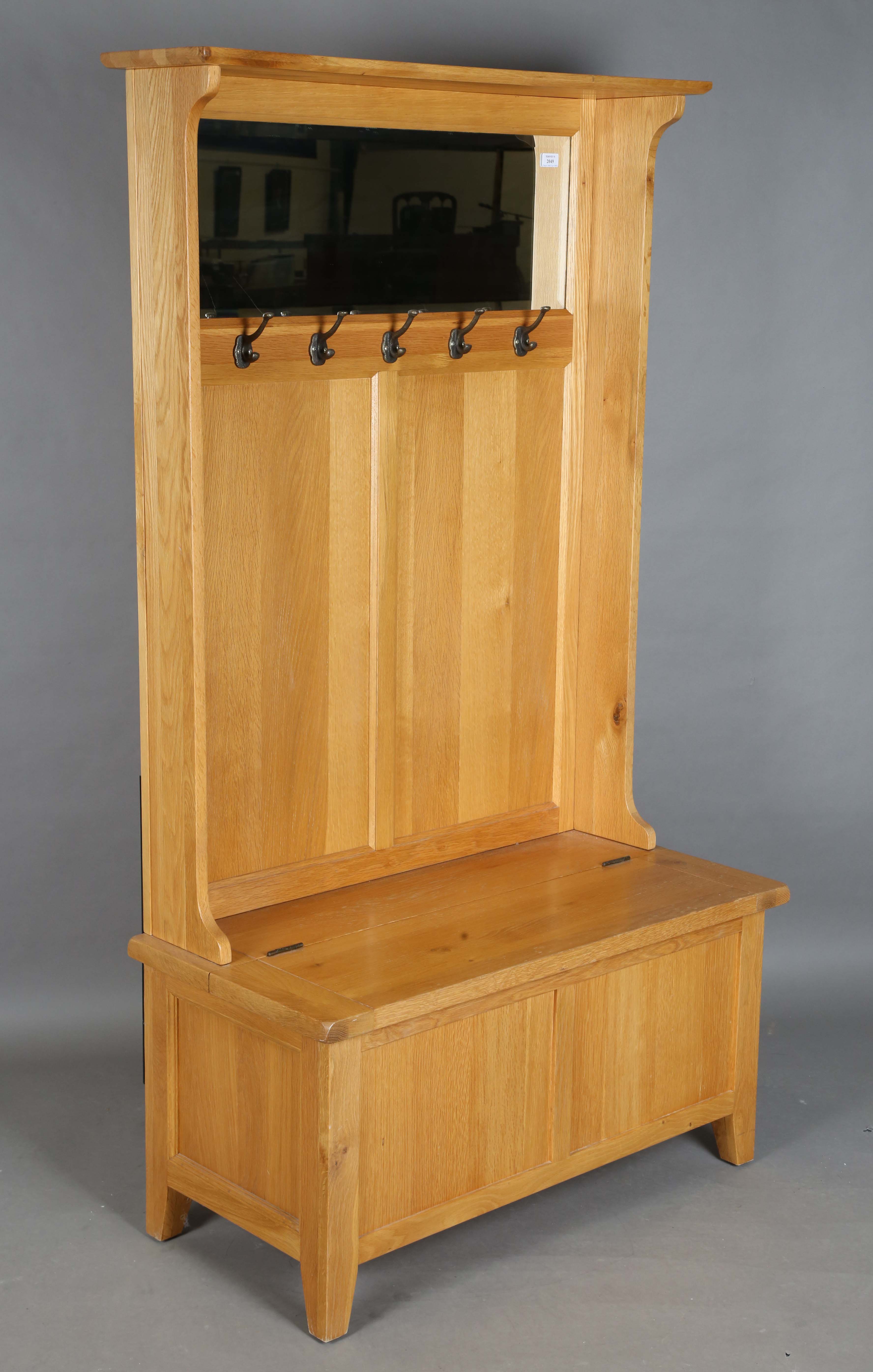 A modern Arts and Crafts style oak box seat hallstand, height 181cm, width 102cm, depth 48cm.