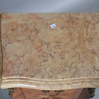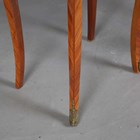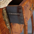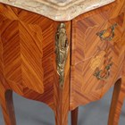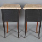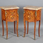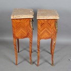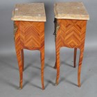 A pair of late 20th century French kingwood and foliate inlaid bedside chests with marble tops, height 74cm, width 41cm, depth 28cm.