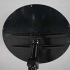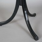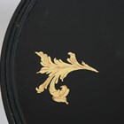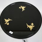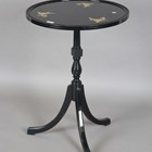 A late 20th century ebonized tripod wine table, the top inset with gilt and black decorated glass, height 70cm, diameter 51cm.
