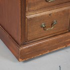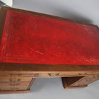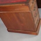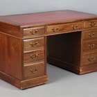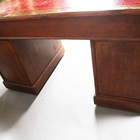 An Edwardian walnut twin-pedestal desk, the top inset with red leather above an arrangement of nine drawers, height 78cm, width 137cm, depth 76cm.