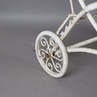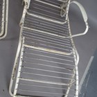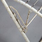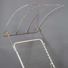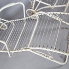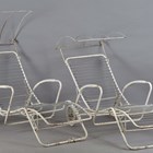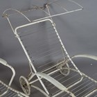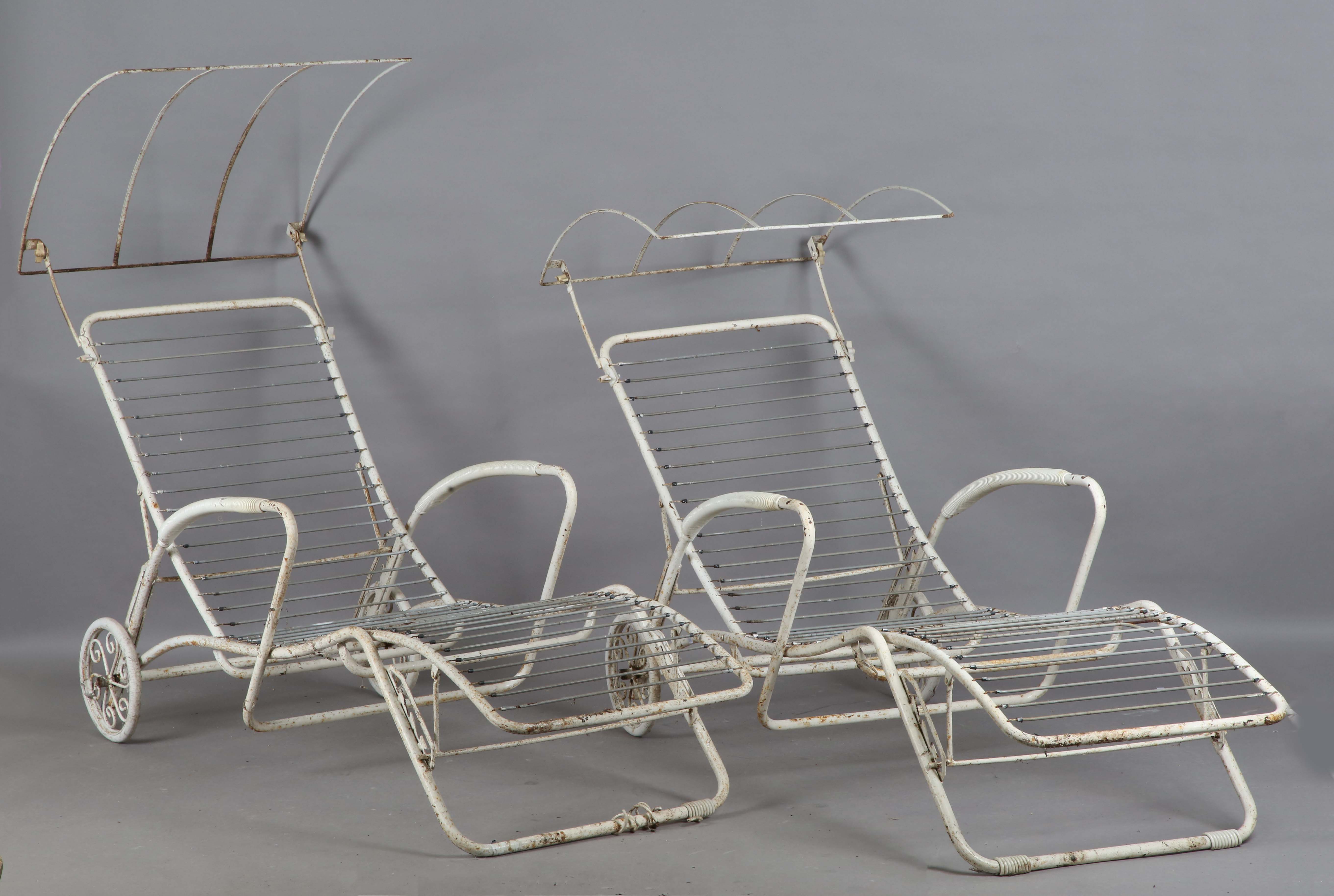 A pair of mid-20th century white painted wrought metal sun loungers with hinged canopies and rear wheels, height 86cm, width 78cm, length 177cm.