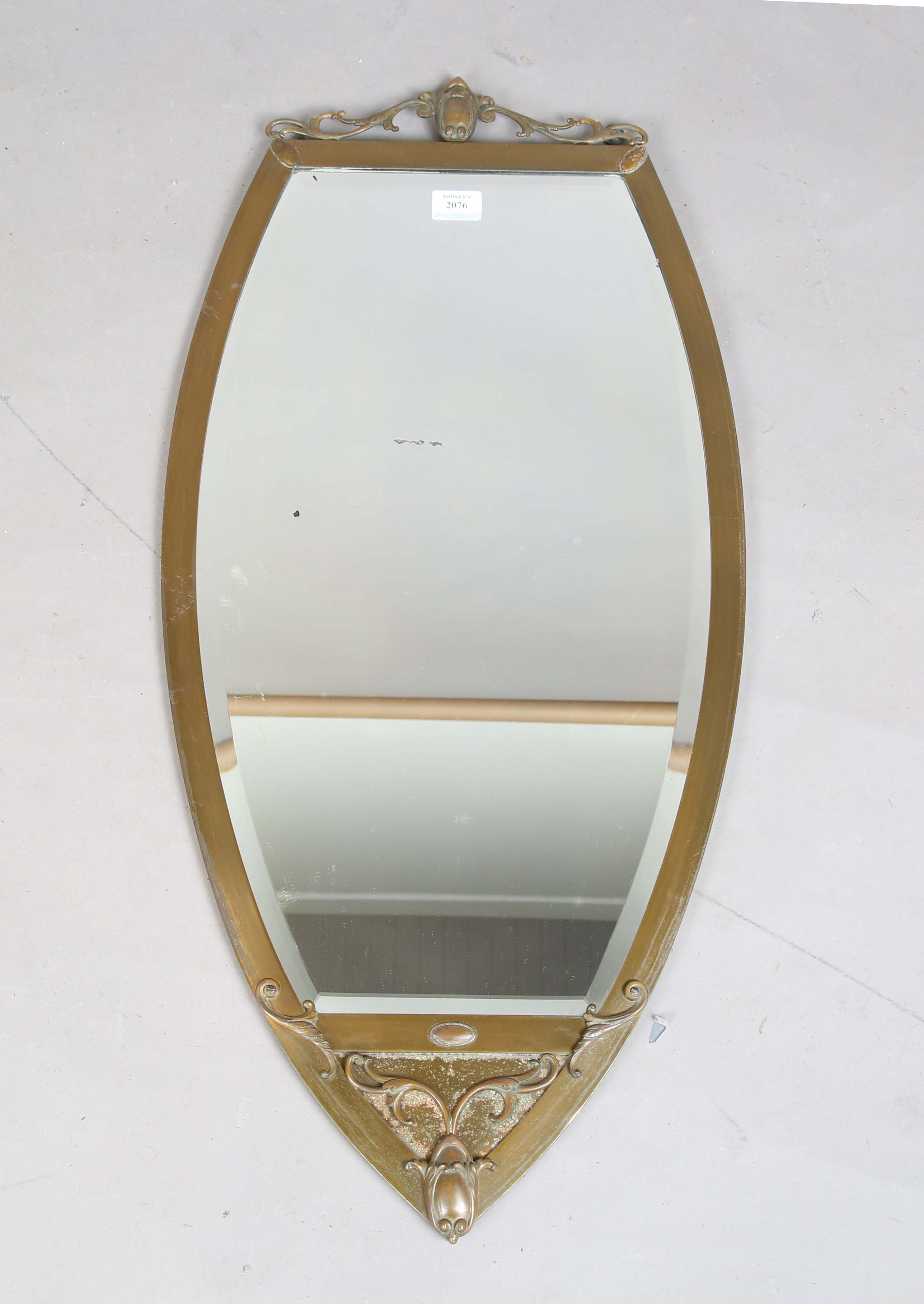 An Edwardian brass wall mirror with bevelled glass and foliate mounts, height 90cm, width 42cm.