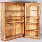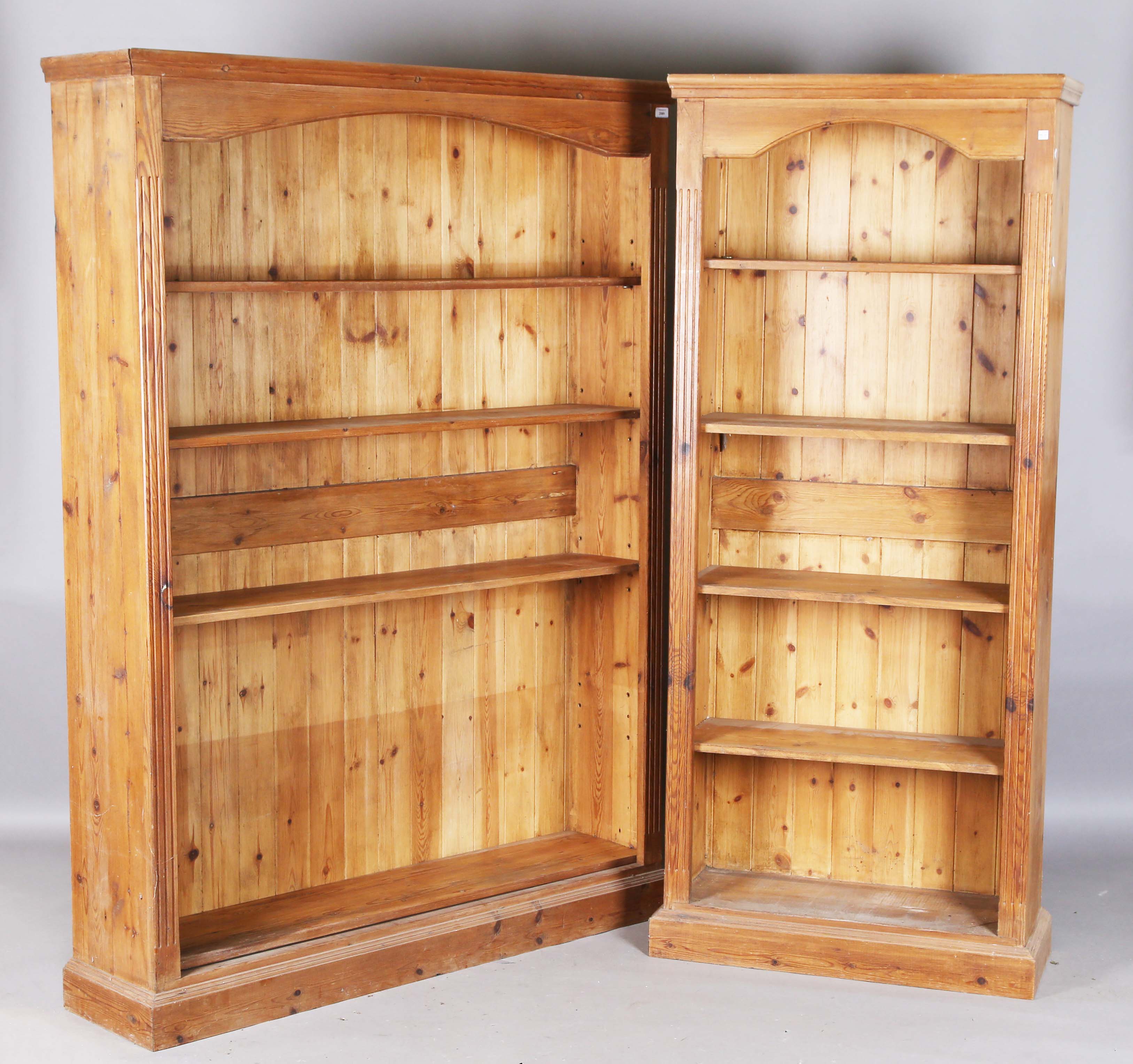 A large late 20th century pine open bookcase, fitted with four adjustable shelves, height 185cm, width 136cm, depth 33cm, together with a smaller bookcase, height 185cm, width 80cm, depth 33cm.