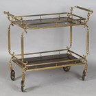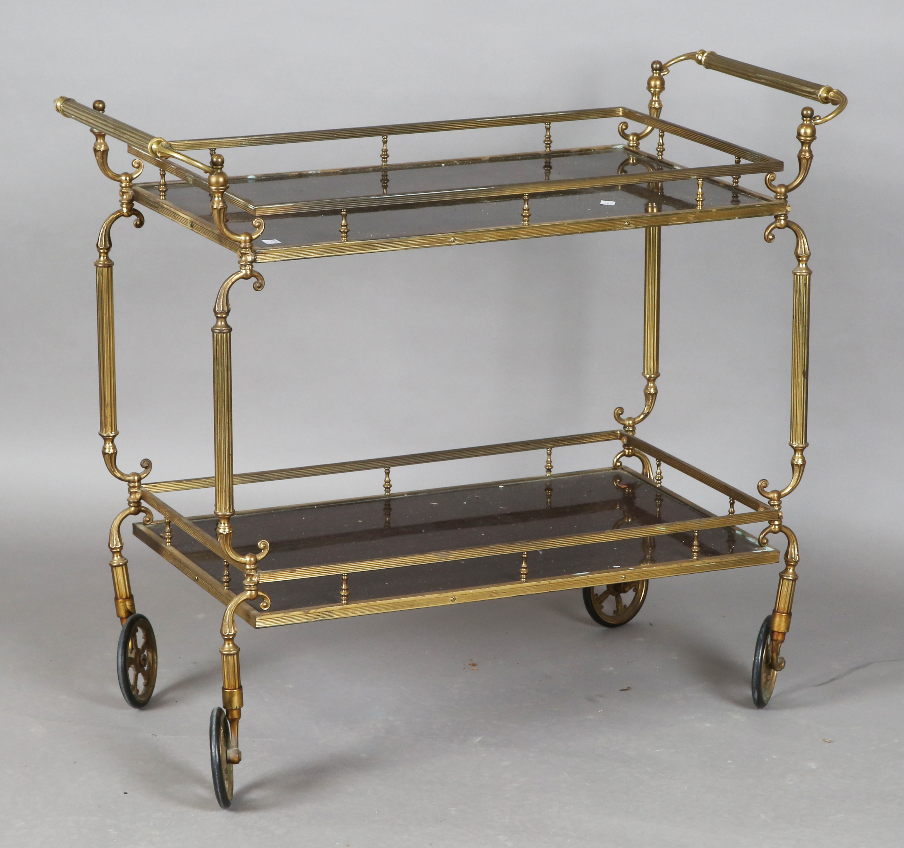 A mid-20th century brass framed two-tier hostess trolley, height 74cm, width 85cm, depth 42cm.