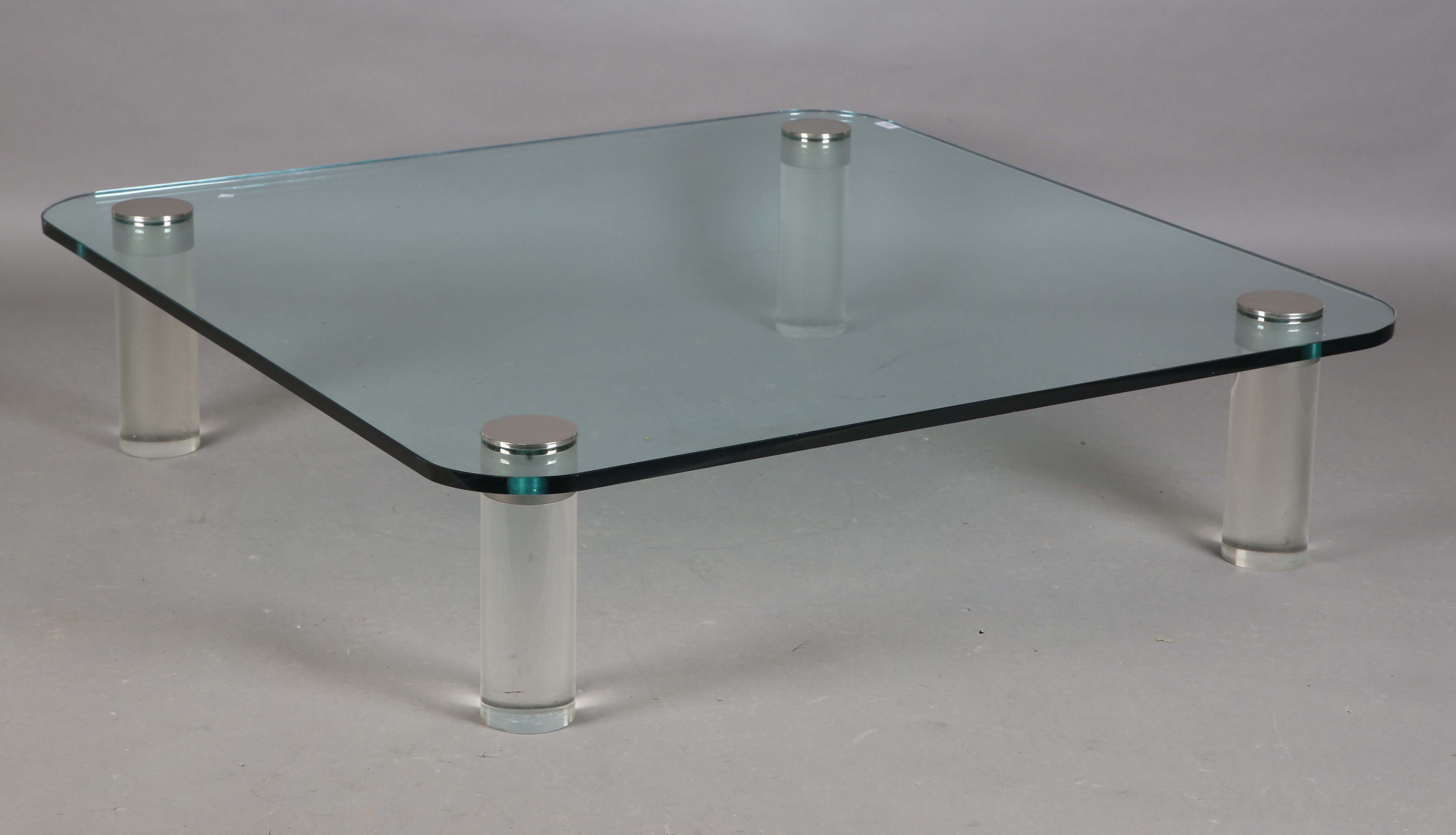 A mid-20th century Italian glass and perspex square coffee table by Alesandro Albrizzi, the legs with metal cappings, height 30cm, width 122cm.