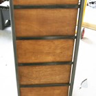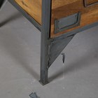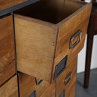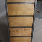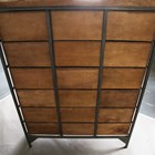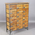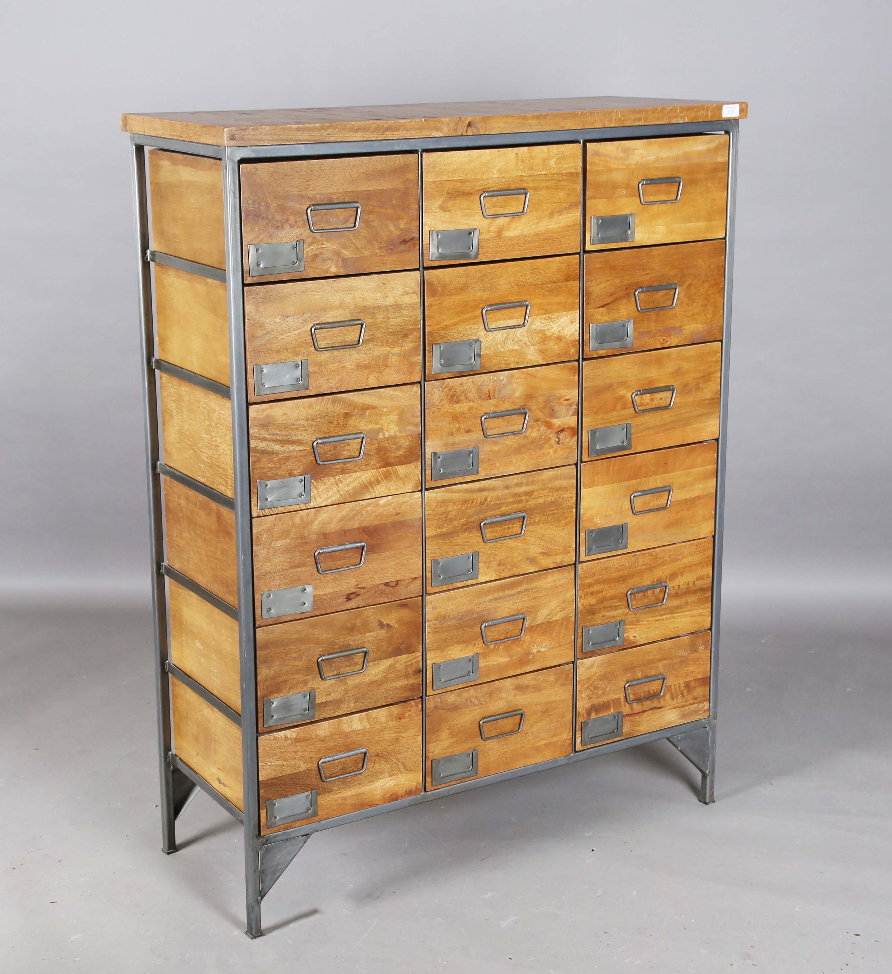 A modern walnut and grey coated metal bank of eighteen drawers, height 137cm, width 104cm, depth 41cm.