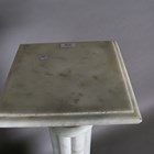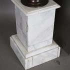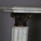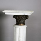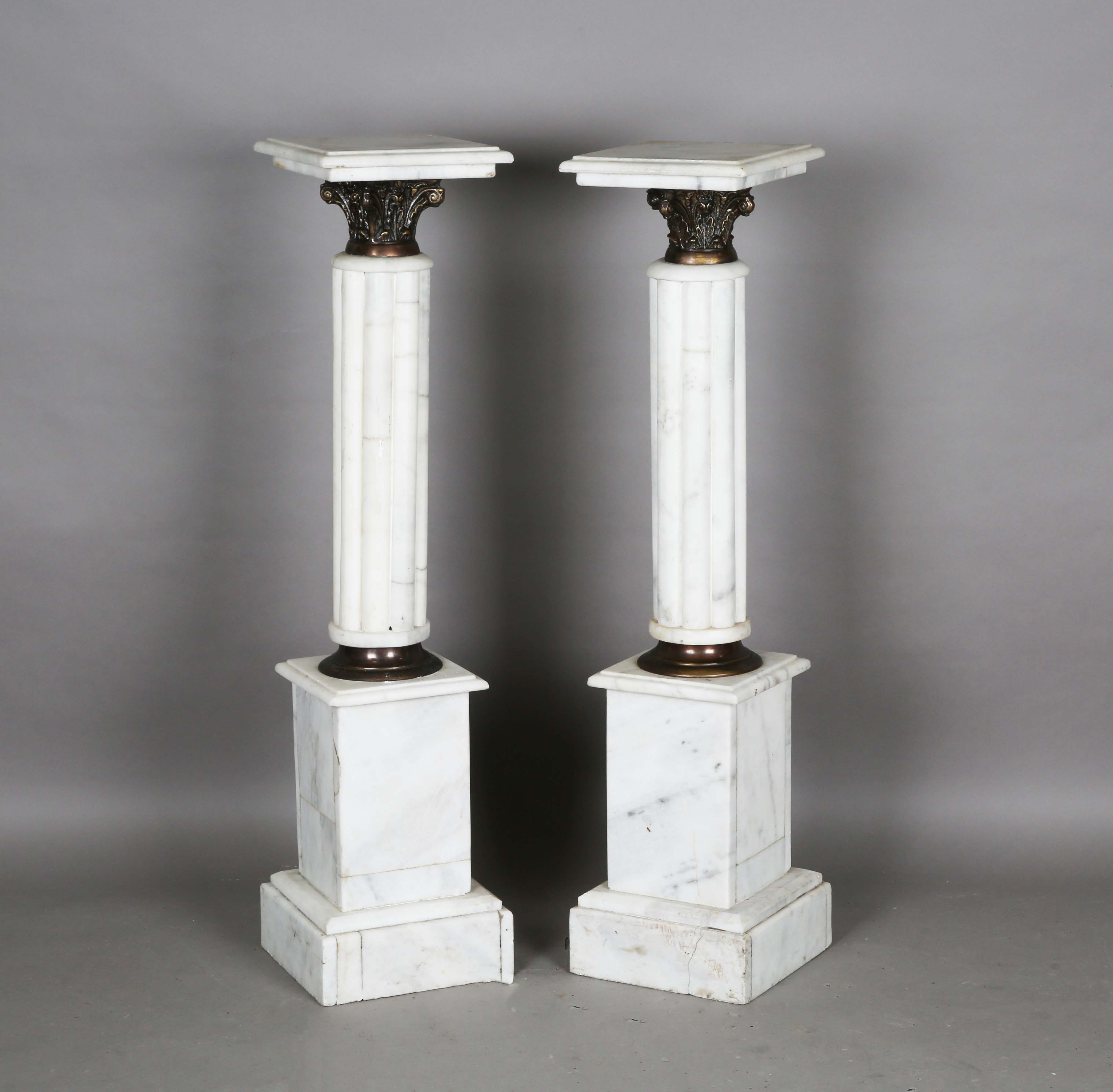 A pair of modern white marble and bronzed metal display pedestals, each square top above a Corinthian capital and reeded stem, height 118cm, width 28cm.