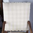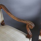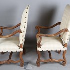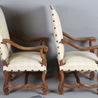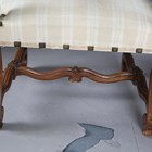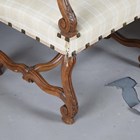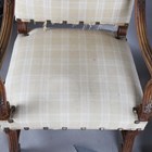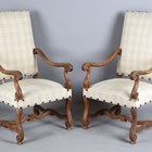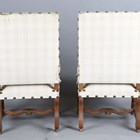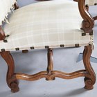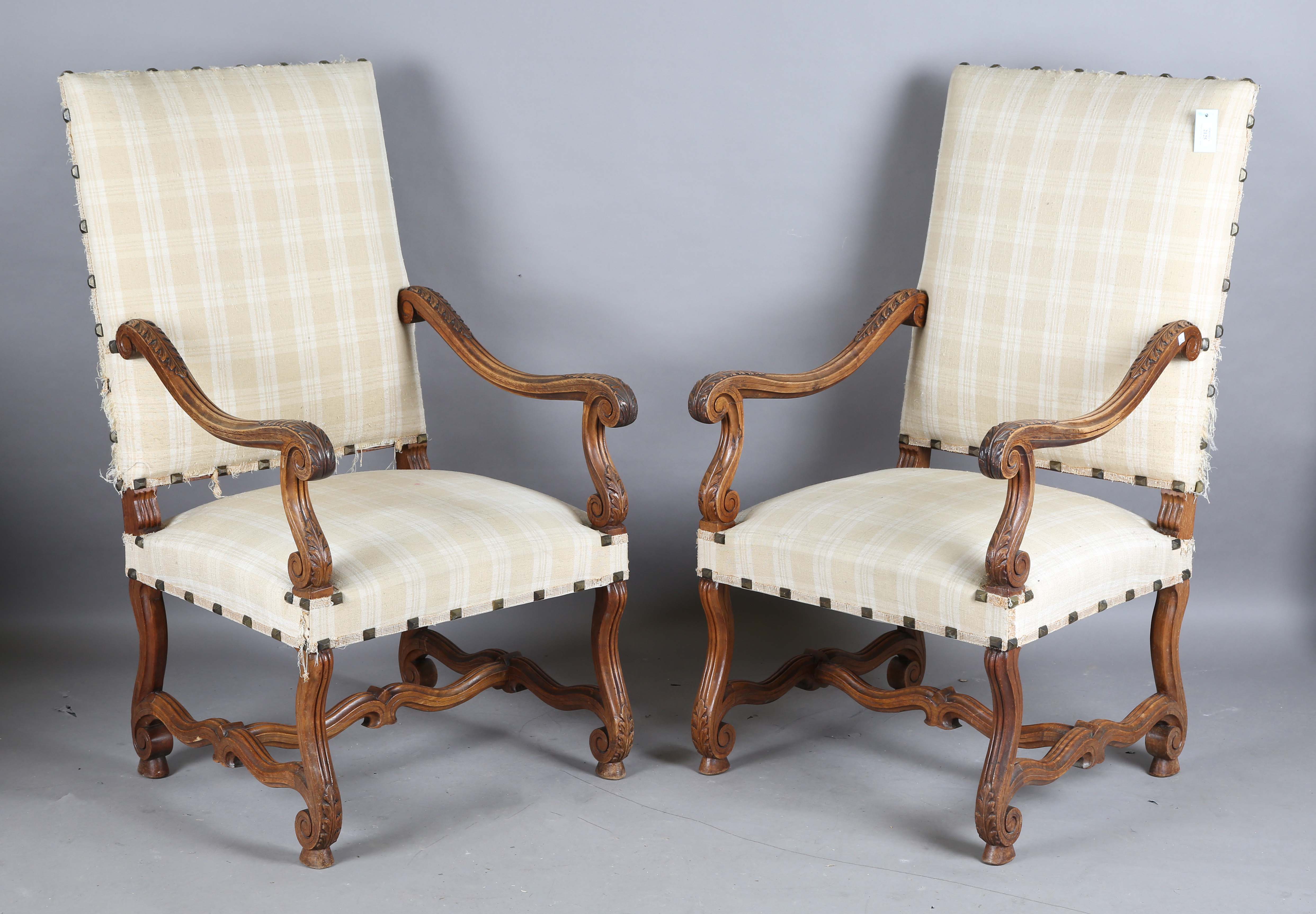 A pair of early 20th century French walnut framed armchairs, upholstered in chequered cream fabric, raised on scrolling legs, height 119cm, width 64cm, depth 76cm.