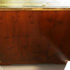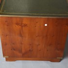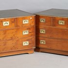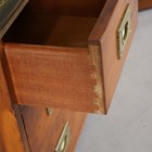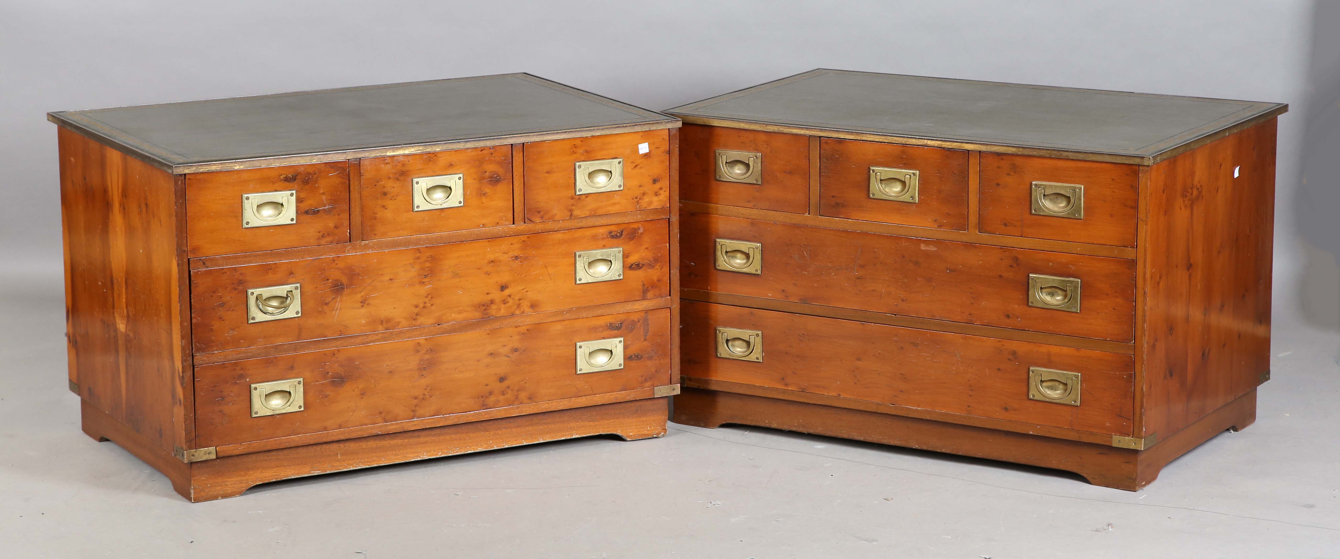 A pair of late 20th century yew and brass mounted campaign style chests, the brass framed tops inset with gilt-tooled green leather, height 57cm, width 92cm, depth 62cm.
