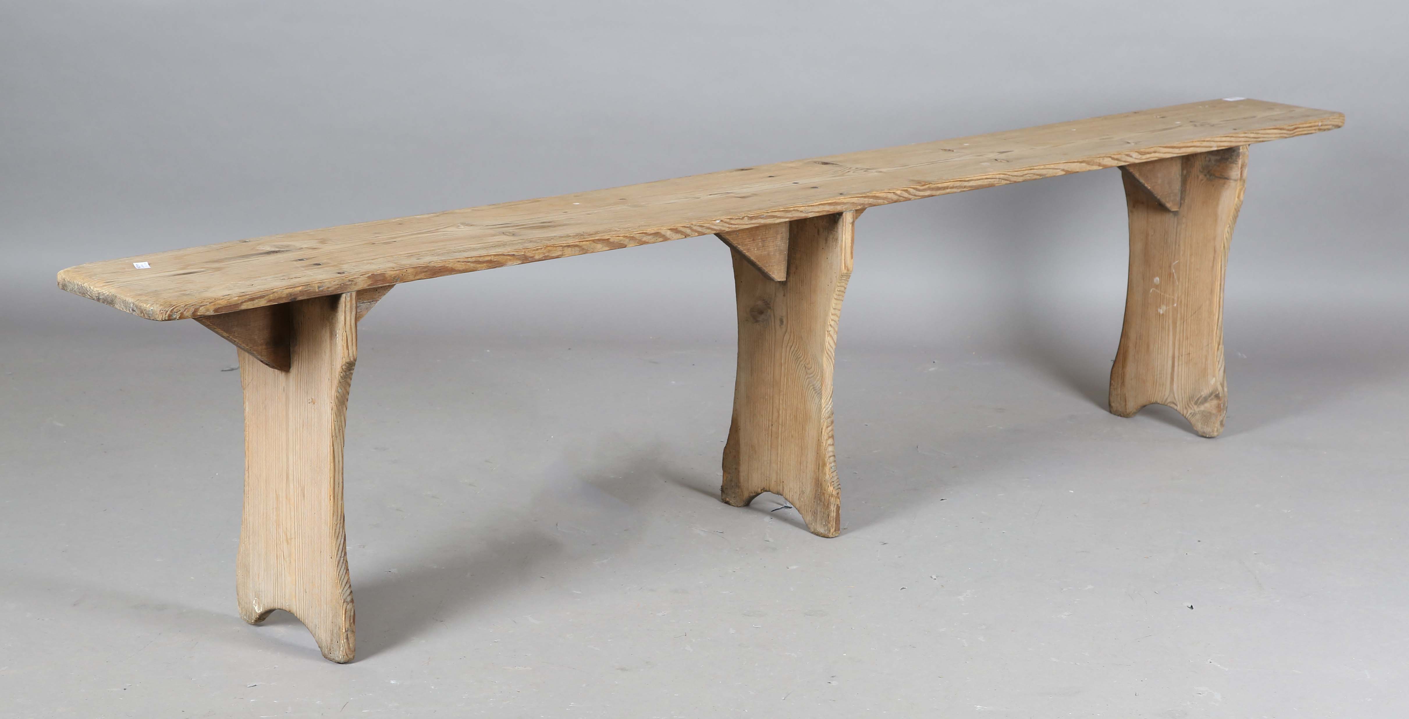 An early 20th century pine bench, height 48cm, length 220cm, depth 23cm.