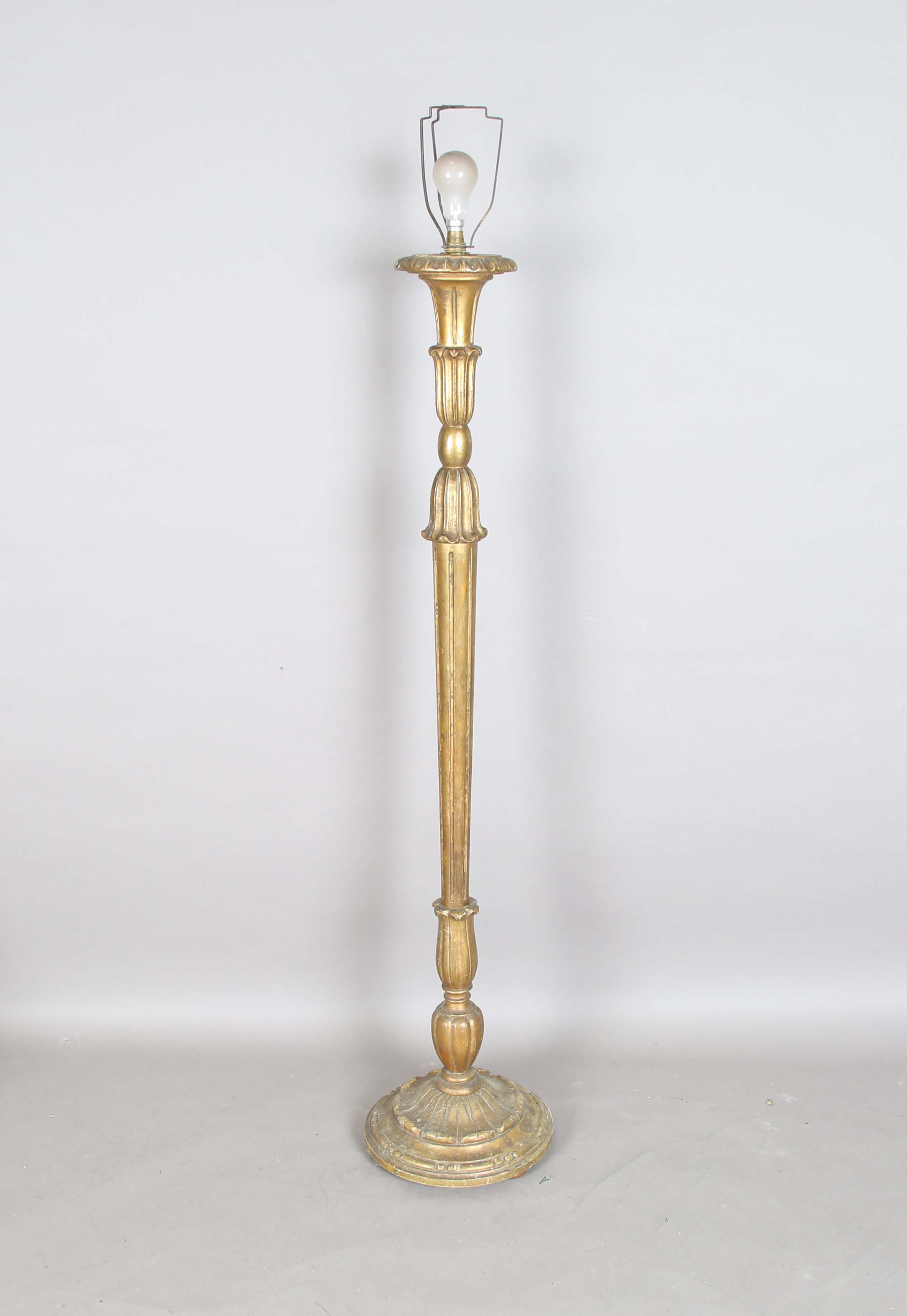 An early 20th century French giltwood lamp standard with a carved and fluted stem, height 150cm.