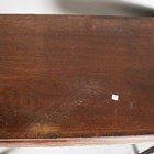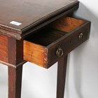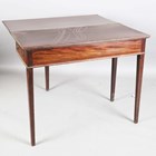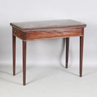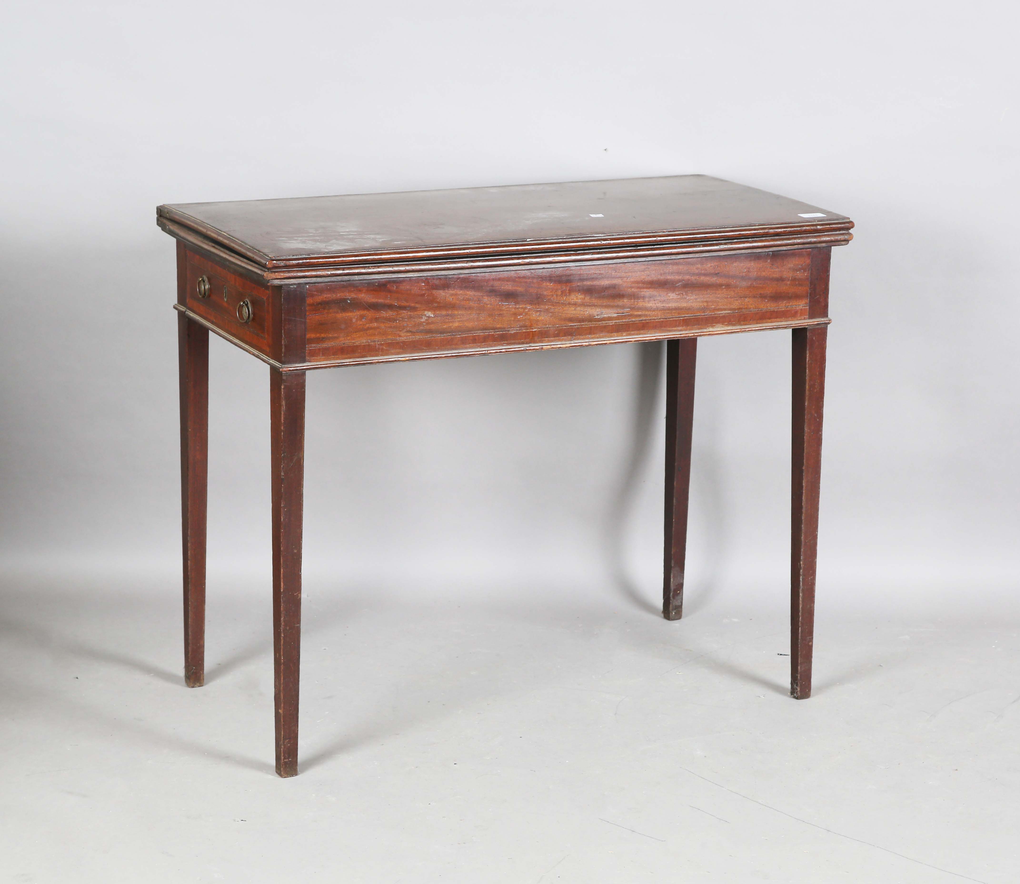 A George III mahogany fold-over tea table, the hinged top with a crossbanded border, height 74cm, width 92cm, depth 43cm.