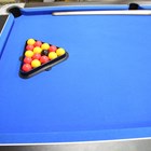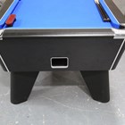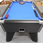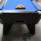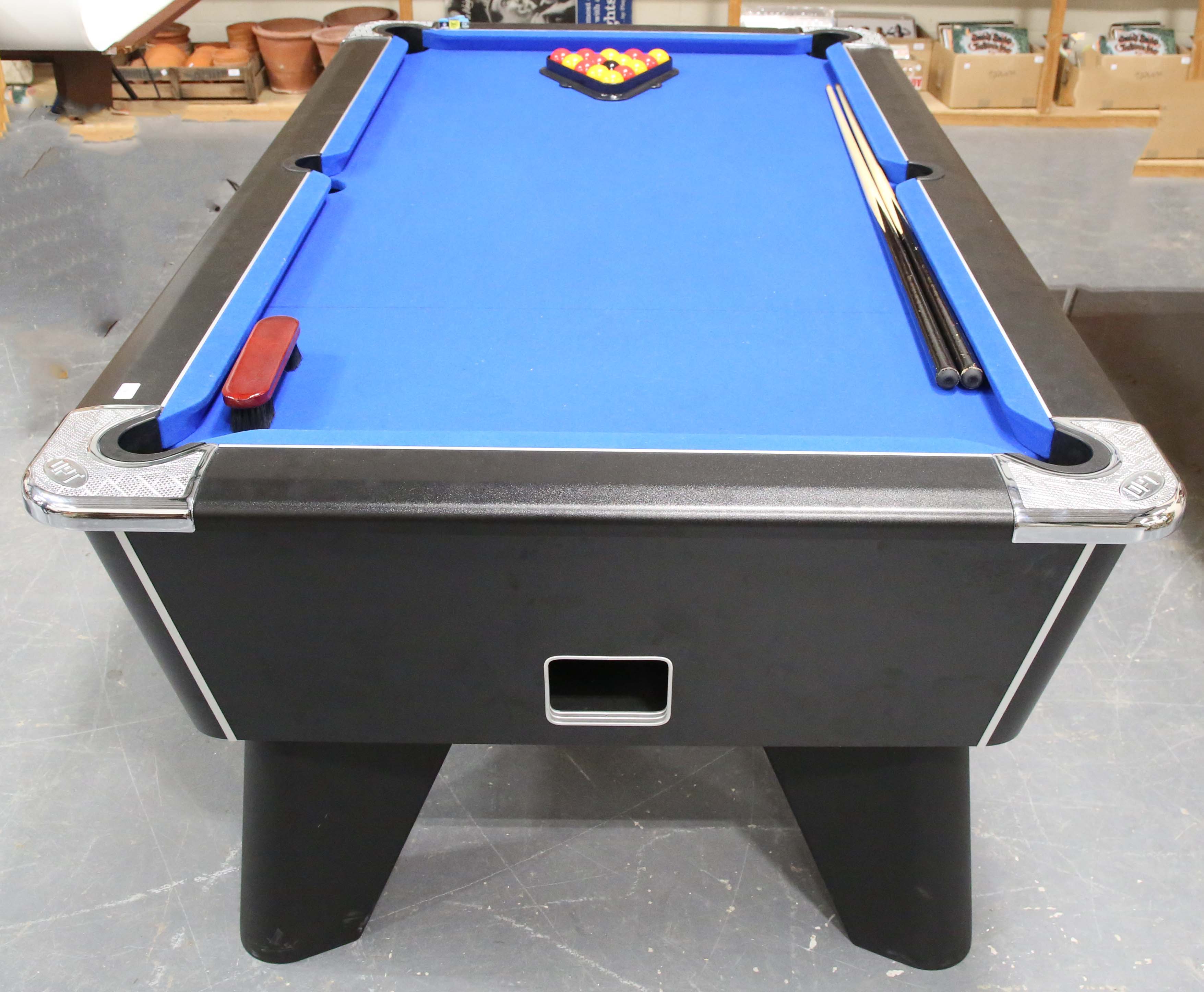 A modern DPT 'Omega' slate bed pool table with blue baize and contactless payment operation, together with balls, cues, nap brushes and other accessories, length 214cm, depth 123cm.