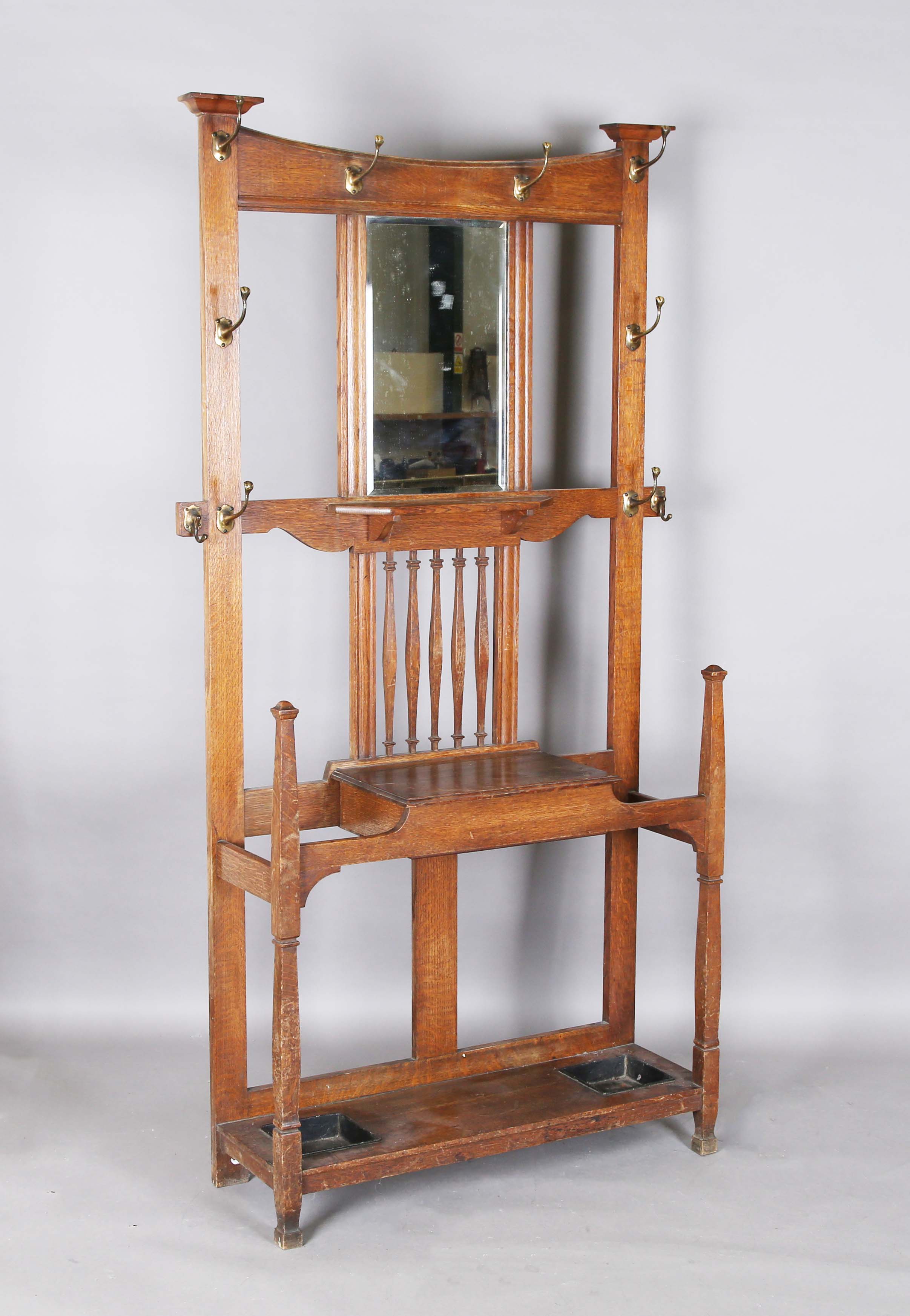 An Edwardian Arts and Crafts oak hallstand, in the manner of Shapland & Petter, height 193cm, width 102cm, depth 31cm.