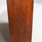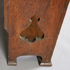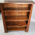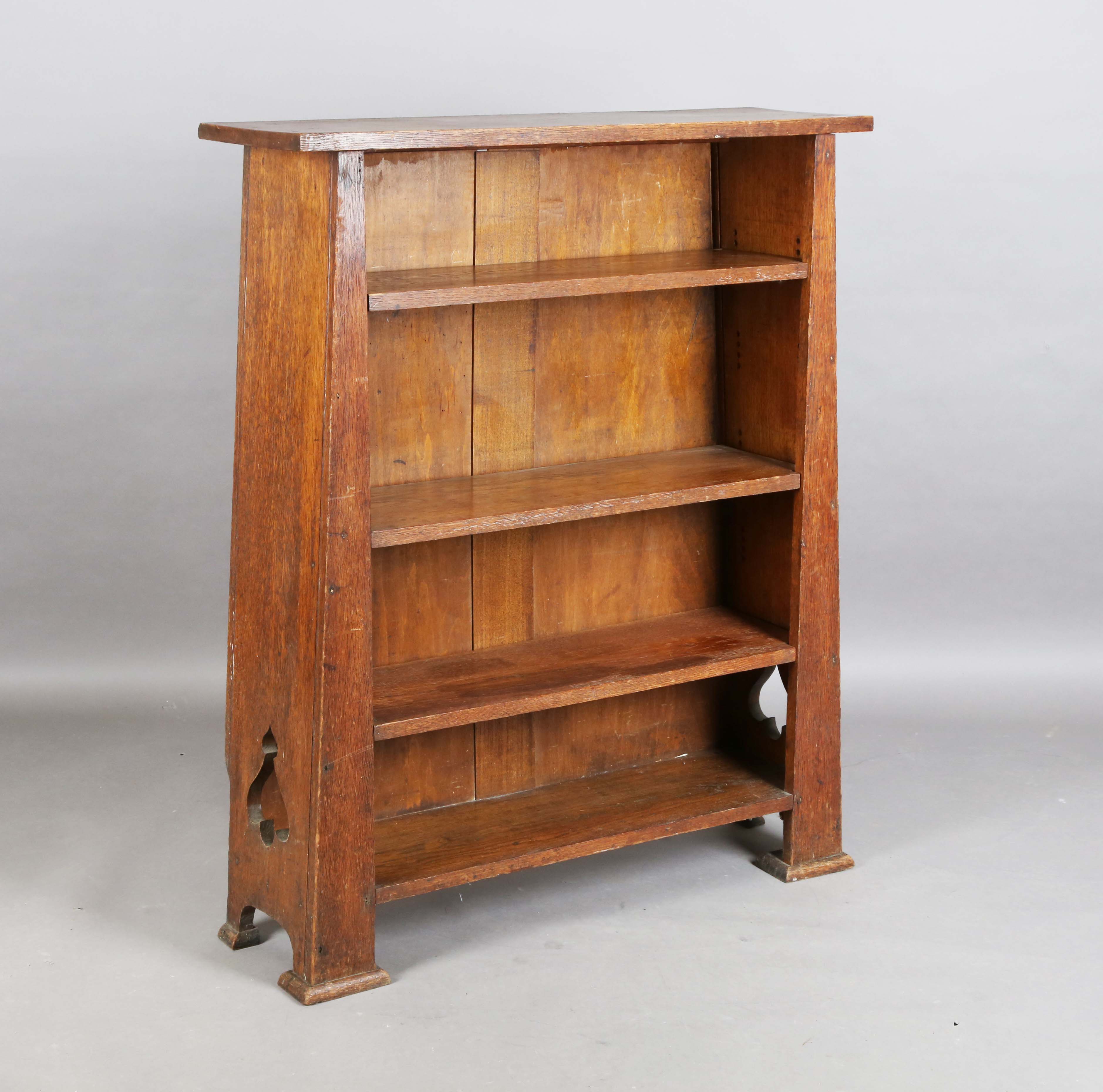 An Edwardian Arts and Crafts oak open bookcase, in the manner of Liberty & Co, the tapering sides with pierced motifs, height 114cm, width 91.5cm, depth 28.5cm.