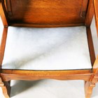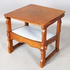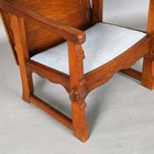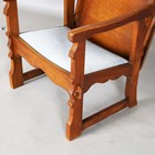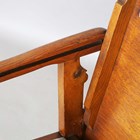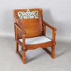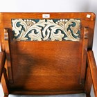 An early 20th century Arts and Crafts style oak metamorphic armchair, the back with carved foliate reserve, hinged to form a table top, the front legs with peg joints, height 73cm, width 58cm, depth 53cm.