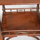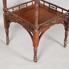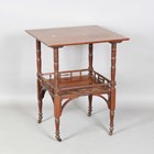 A late Victorian Aesthetic Movement walnut two-tier centre table, in the manner of E.W. Godwin, raised on ring turned legs united by a galleried undertier, height 69cm, width 56cm.