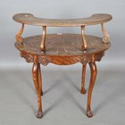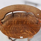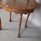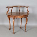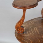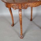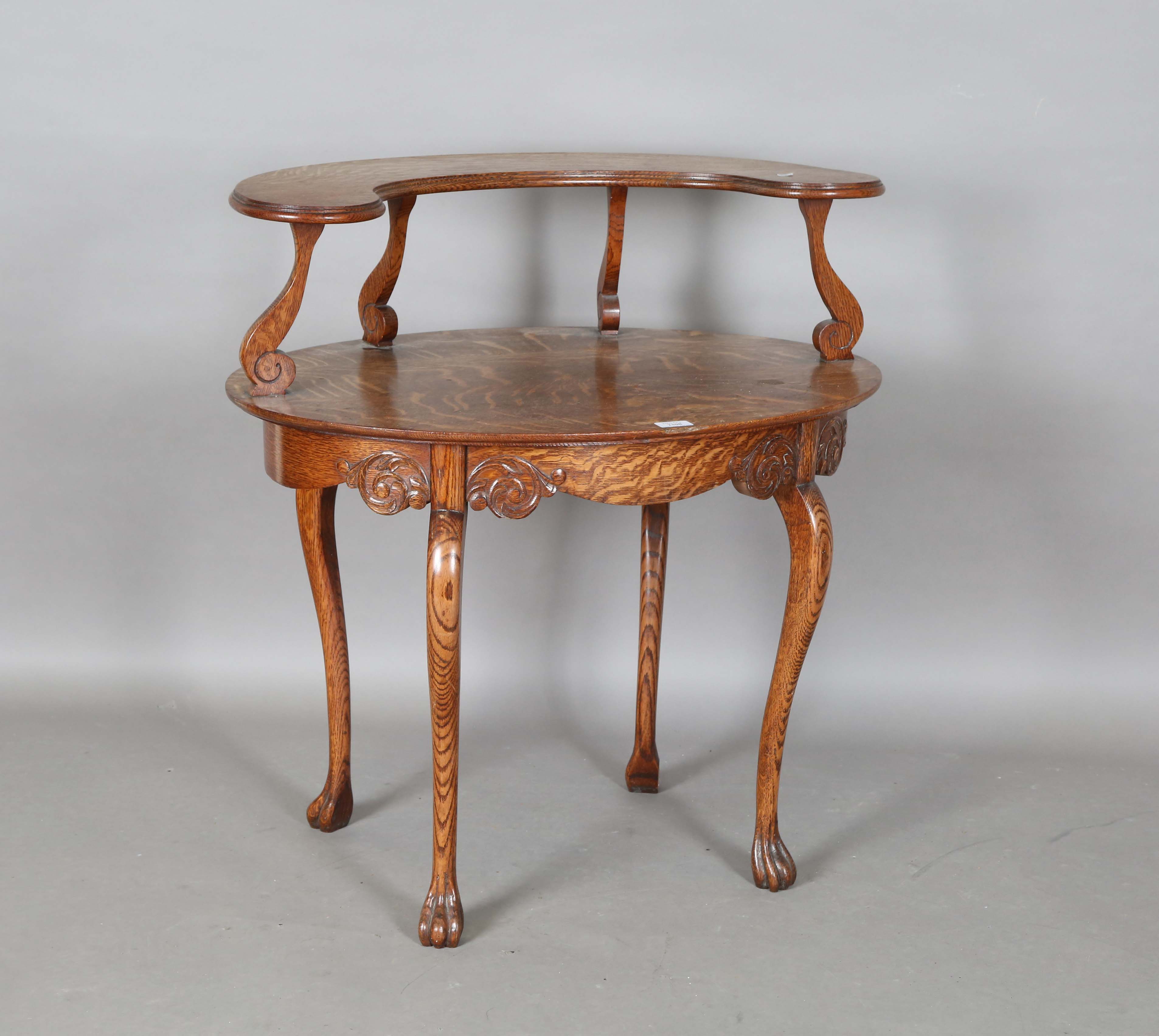 An unusual early 20th century Arts and Crafts oak oval occasional table with a shaped gallery and carved frieze, height 80cm, width 76cm, depth 56cm.