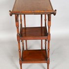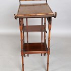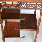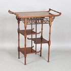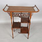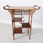 A late Victorian Aesthetic Movement mahogany occasional table, in the manner of E.W. Godwin, the crossbanded top above a pierced fretwork frieze and three asymmetrical tiers, height 75cm, width 69cm, depth 34cm (some faults and repairs).