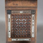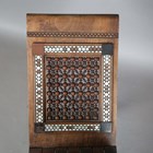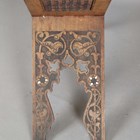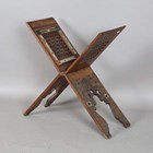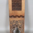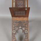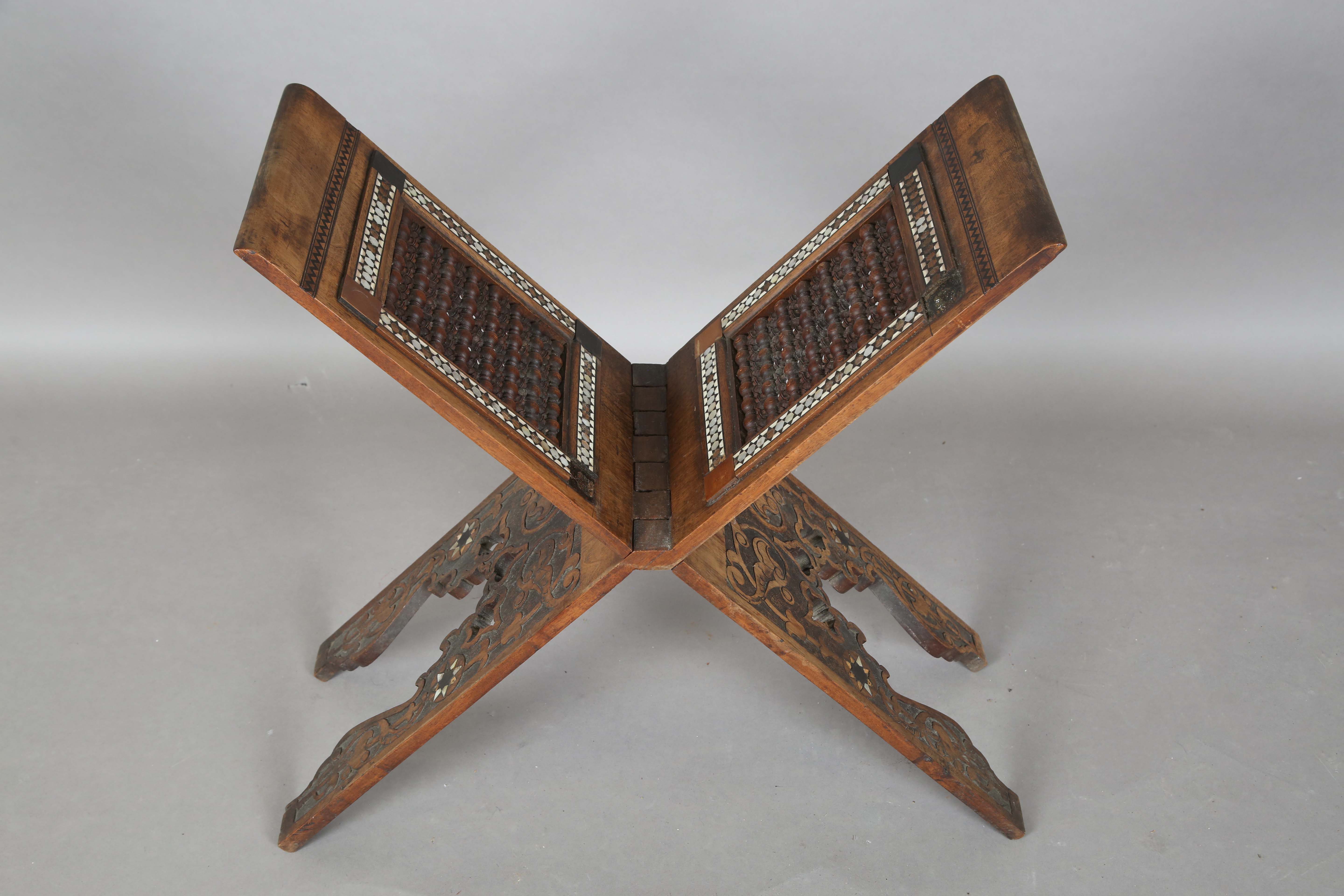 An early 20th century Middle Eastern walnut and mother-of-pearl inlaid folding 'X' frame bookstand, inset with two panels of mashrabiya, height 60cm, width 55cm, depth 24.5cm (faults).