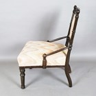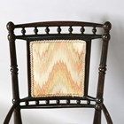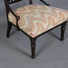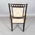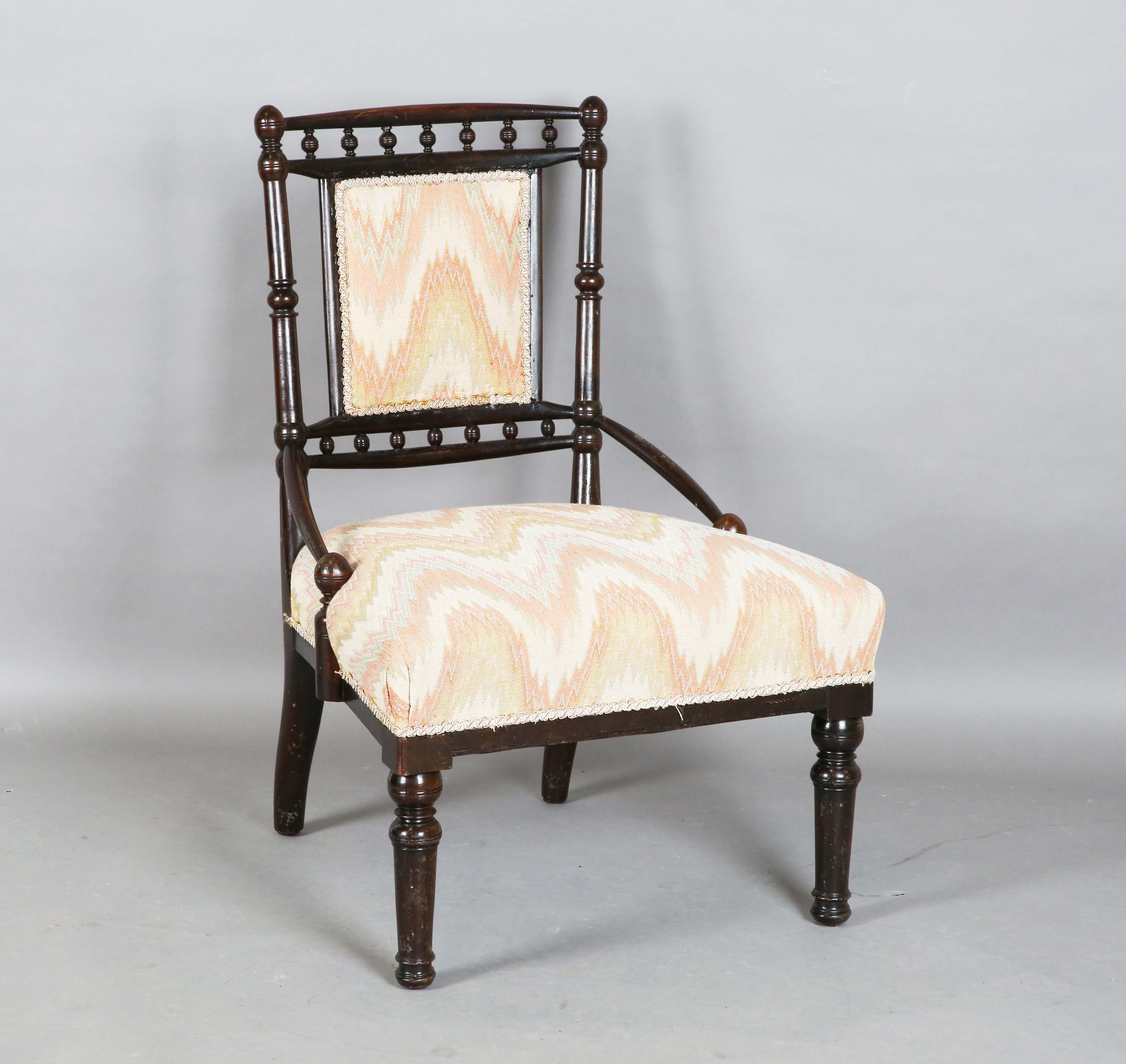 A late Victorian Aesthetic Movement stained beech salon chair with turned spindle back and angular supports, height 85cm, width 59cm, depth 50cm.