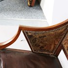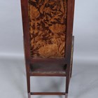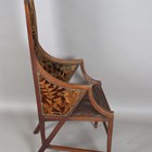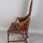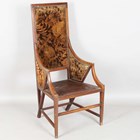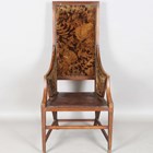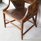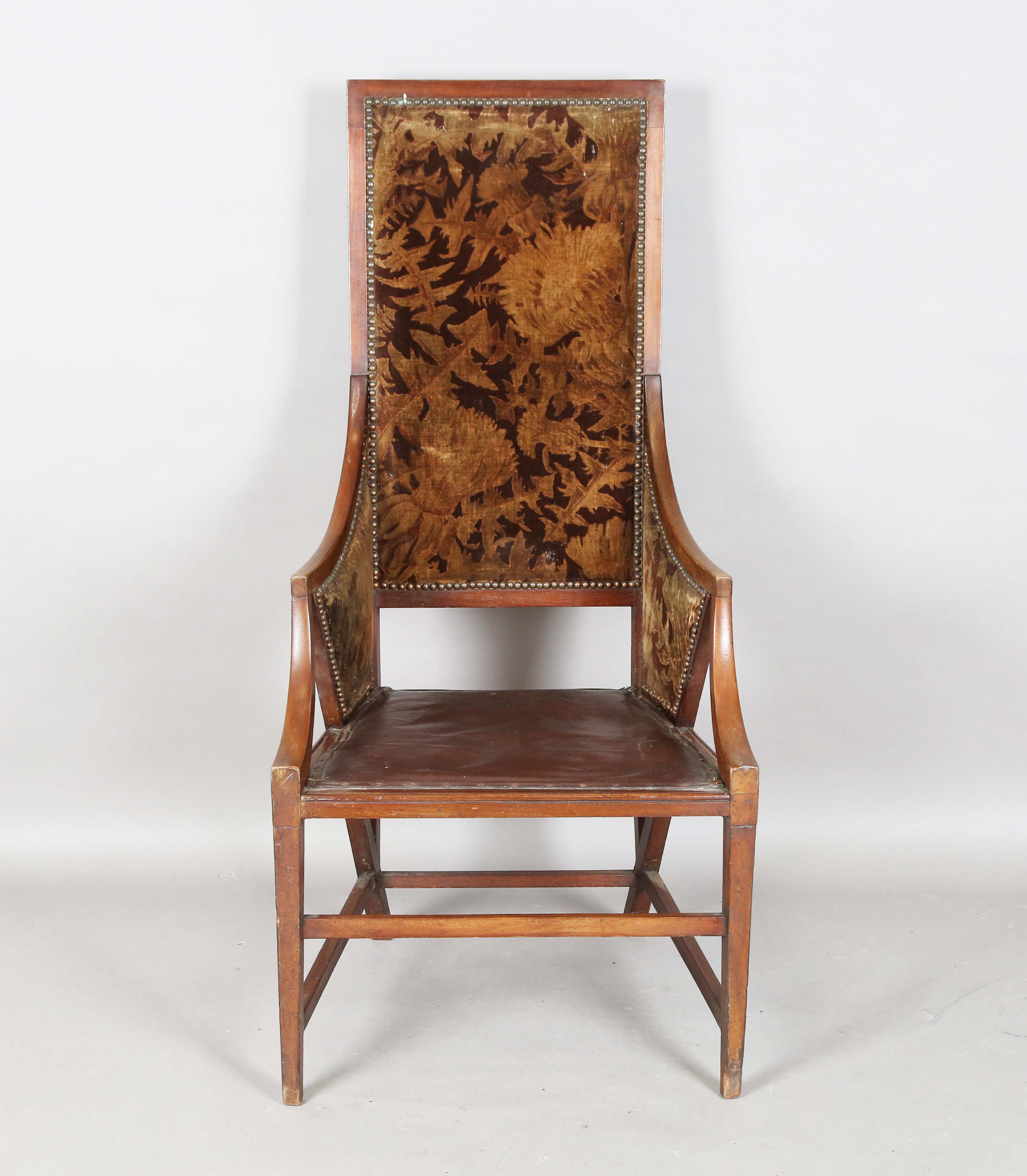 A scarce early 20th century Anglo-Japonaiserie style mahogany framed elbow chair, designed by Giacomo Cometti (1863-1938), the padded seat and back flanked by angular armrests, height 117cm, width 56cm, depth 58cm. Note: Giacomo Cometti, the renowned Italian sculptor, was encouraged by his tutor, Leonardo Bistolfi, to pursue cabinet making and applied arts in the modernist style, in which he favoured the Arts and Crafts Liberty style. Also heavily influenced by C.R. Mackintosh and Henry Van de Velde, you can see these influences in this Anglo-Japanese style chair.