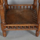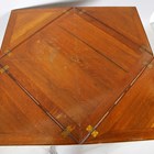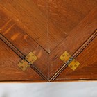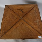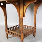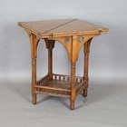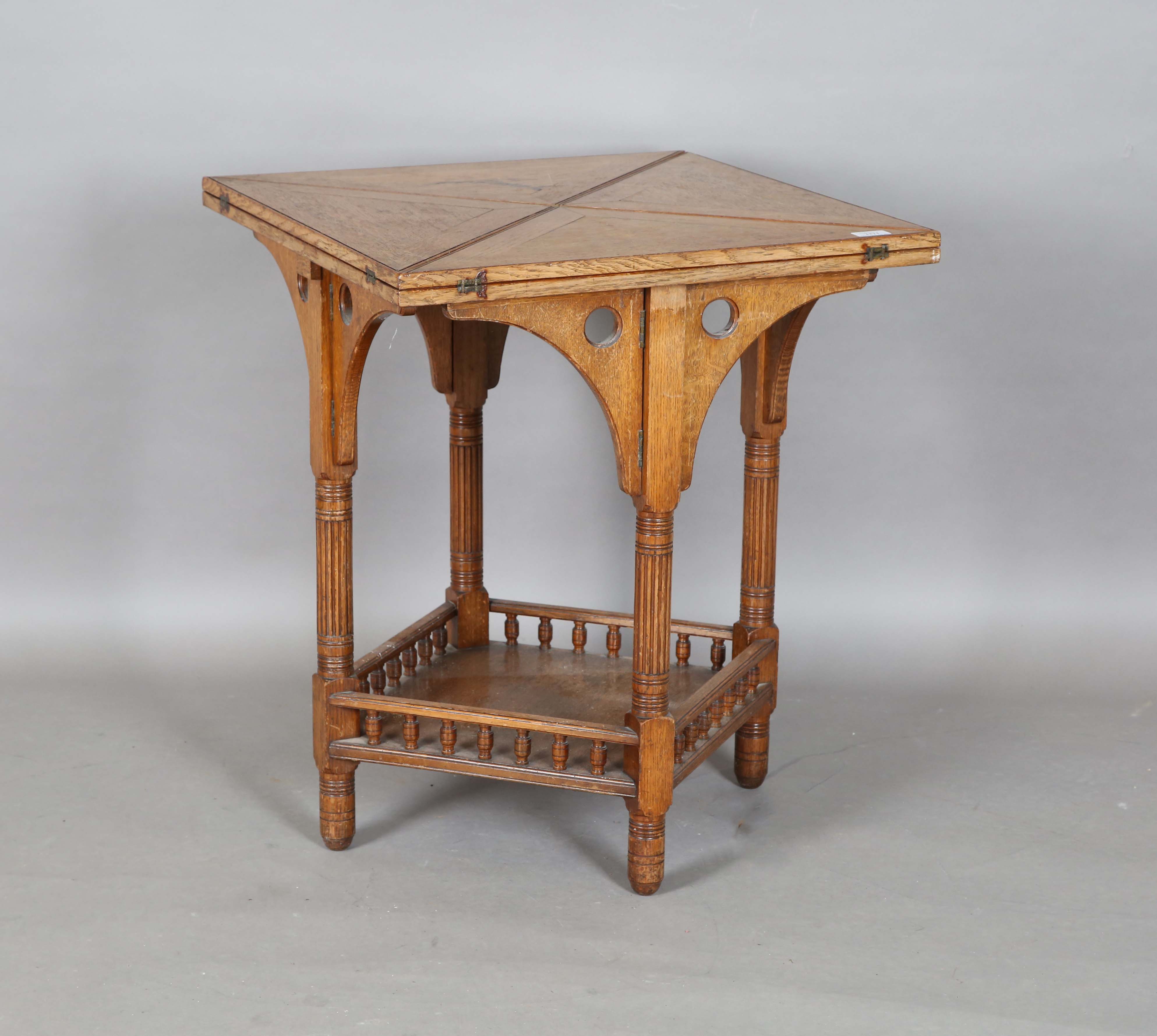 An Edwardian Aesthetic Movement oak envelope tea table, in the manner of James Shoolbred & Co, the hinged apron panels acting as supports above a galleried undertier, height 70cm, width 60.5cm.