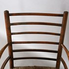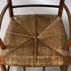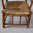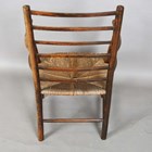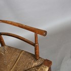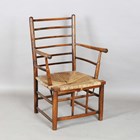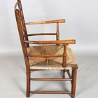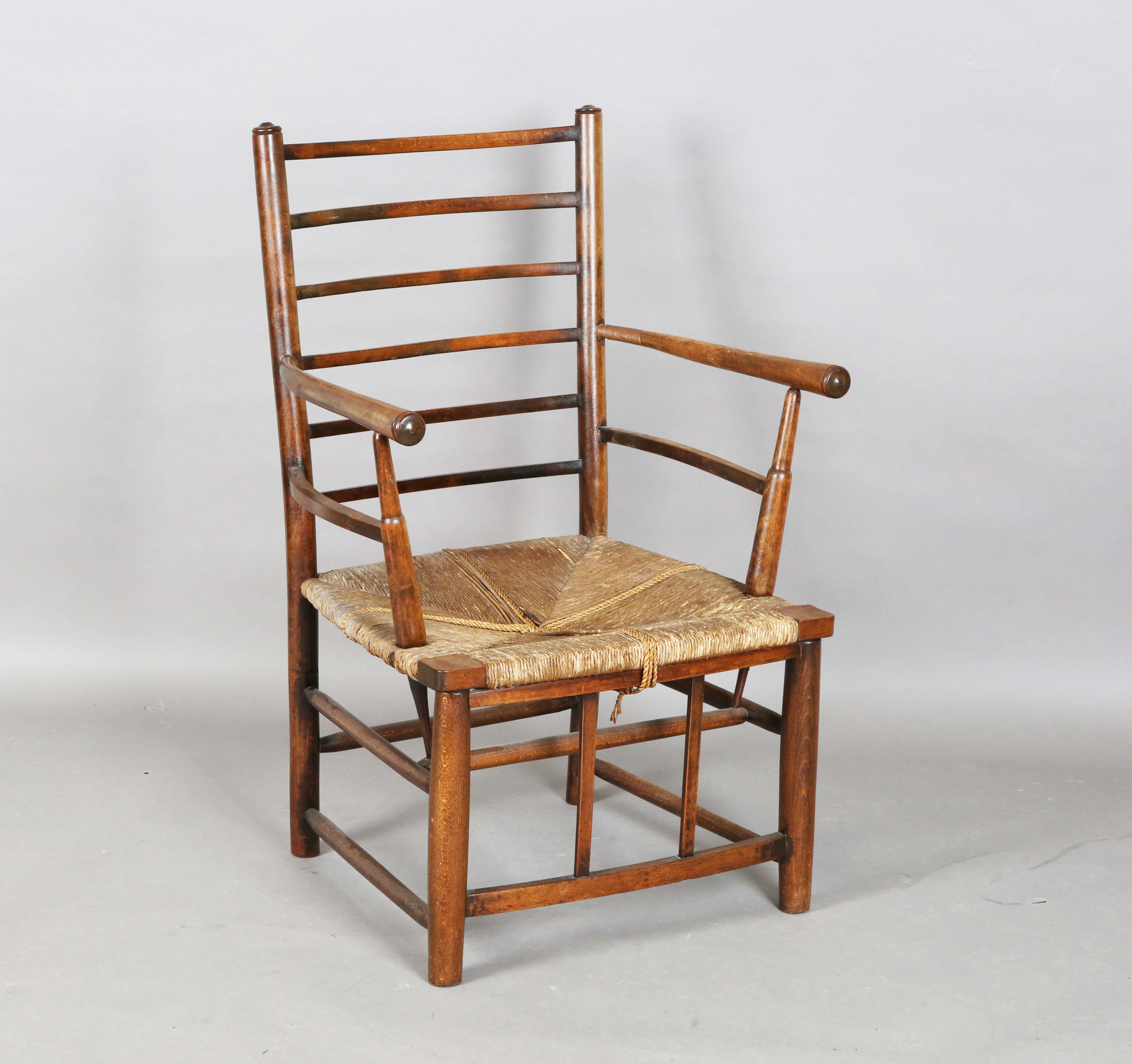 A late 19th century beech framed Sussex armchair, in the manner of Morris & Co, raised on later turned legs, height 82cm, width 54cm, depth 50cm (alterations and restoration).