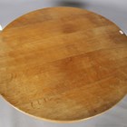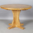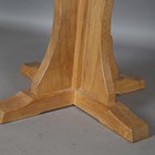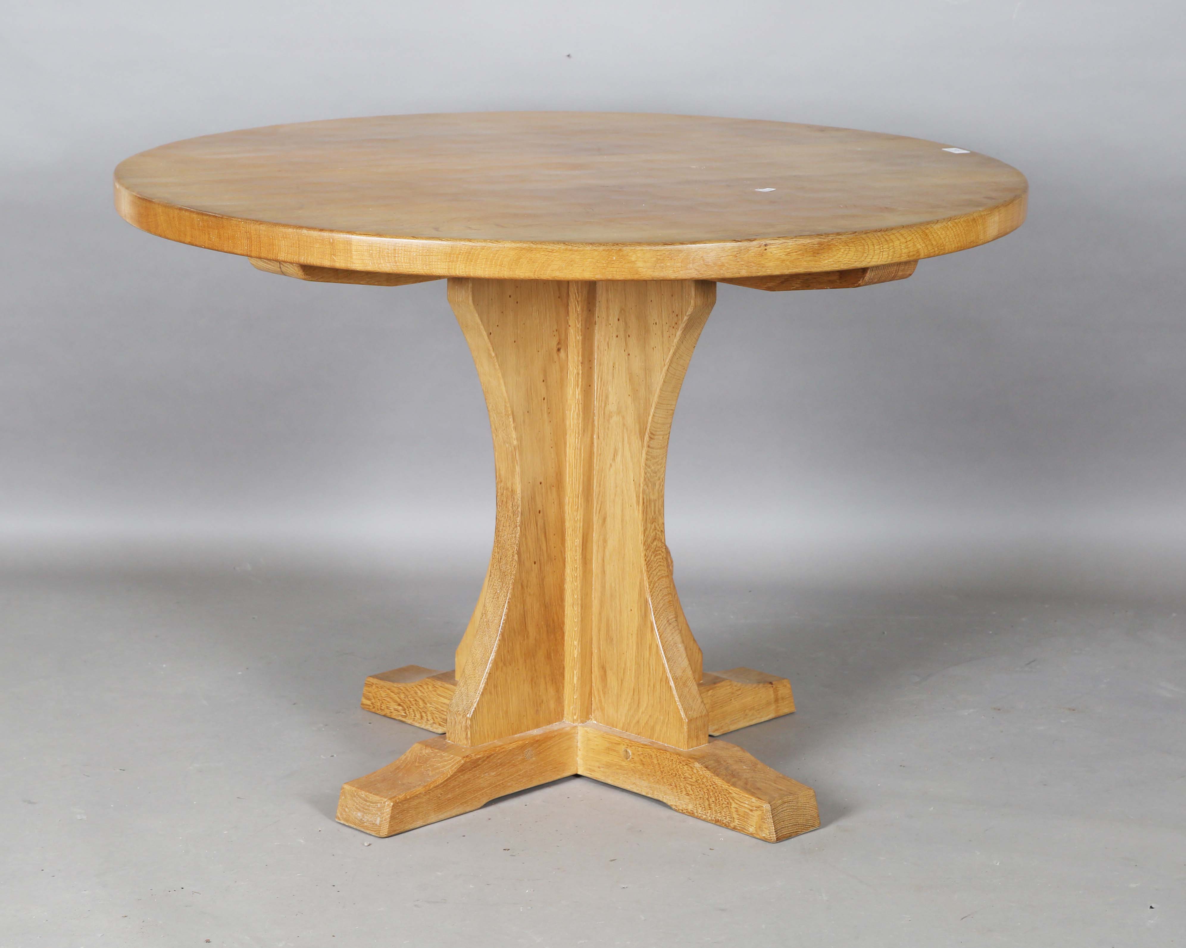 A Robert 'Mouseman' Thompson oak circular supper table, the adzed top on a quatreform base bearing carved mouse signature, height 73cm, diameter 107cm.