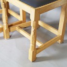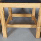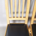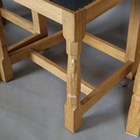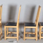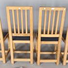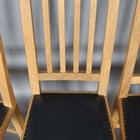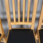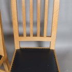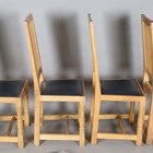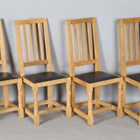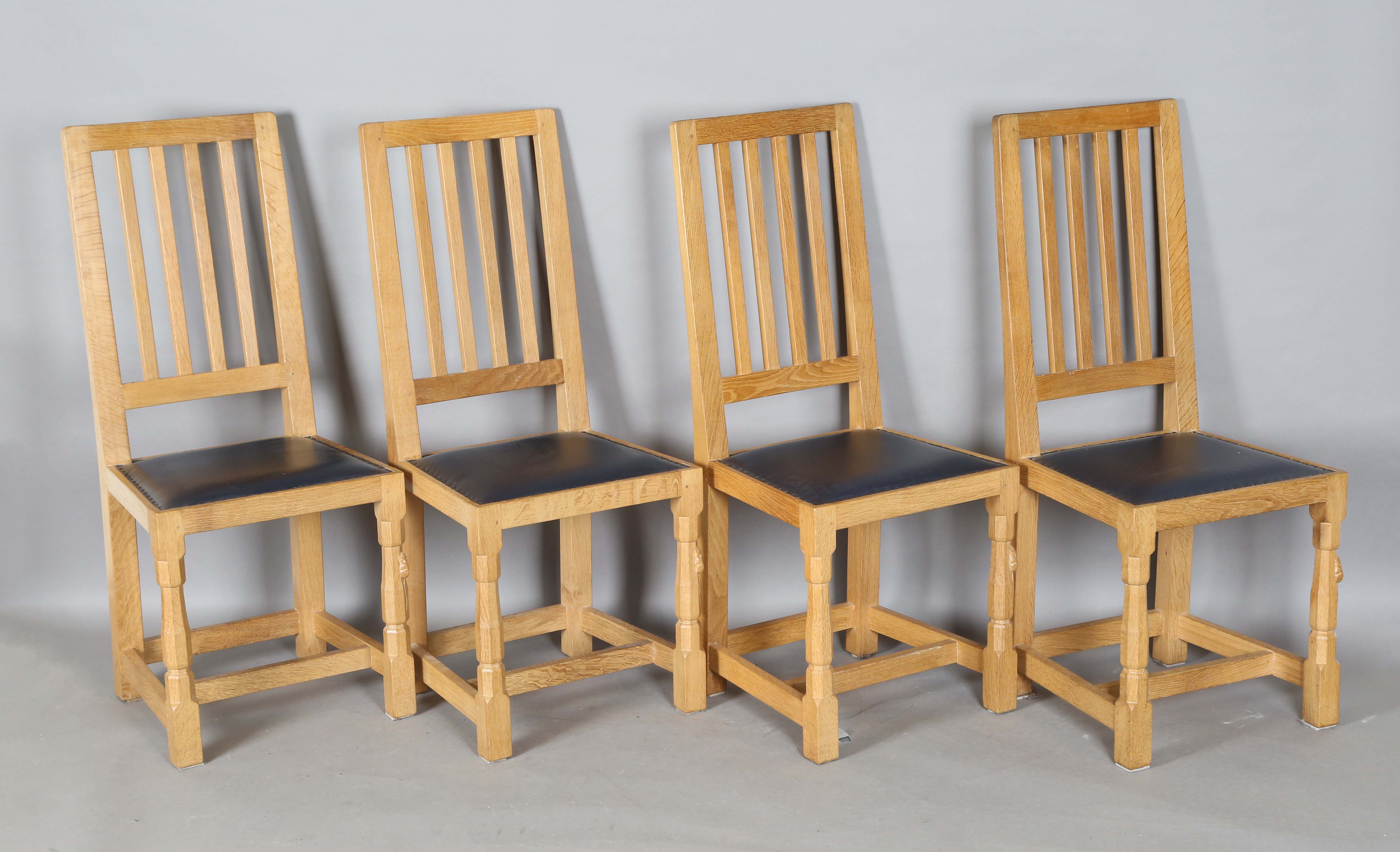 A set of four Robert 'Mouseman' Thompson oak framed rail back dining chairs, the seats upholstered in navy blue leather and raised on octagonal baluster legs, each bearing mouse signature, height 107cm, width 45cm, depth 45cm.