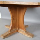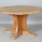 A Robert 'Mouseman' Thompson oak octagonal dining table, the adzed top above a quatreform base bearing carved mouse signature, height 73cm, width 120cm.