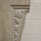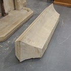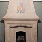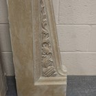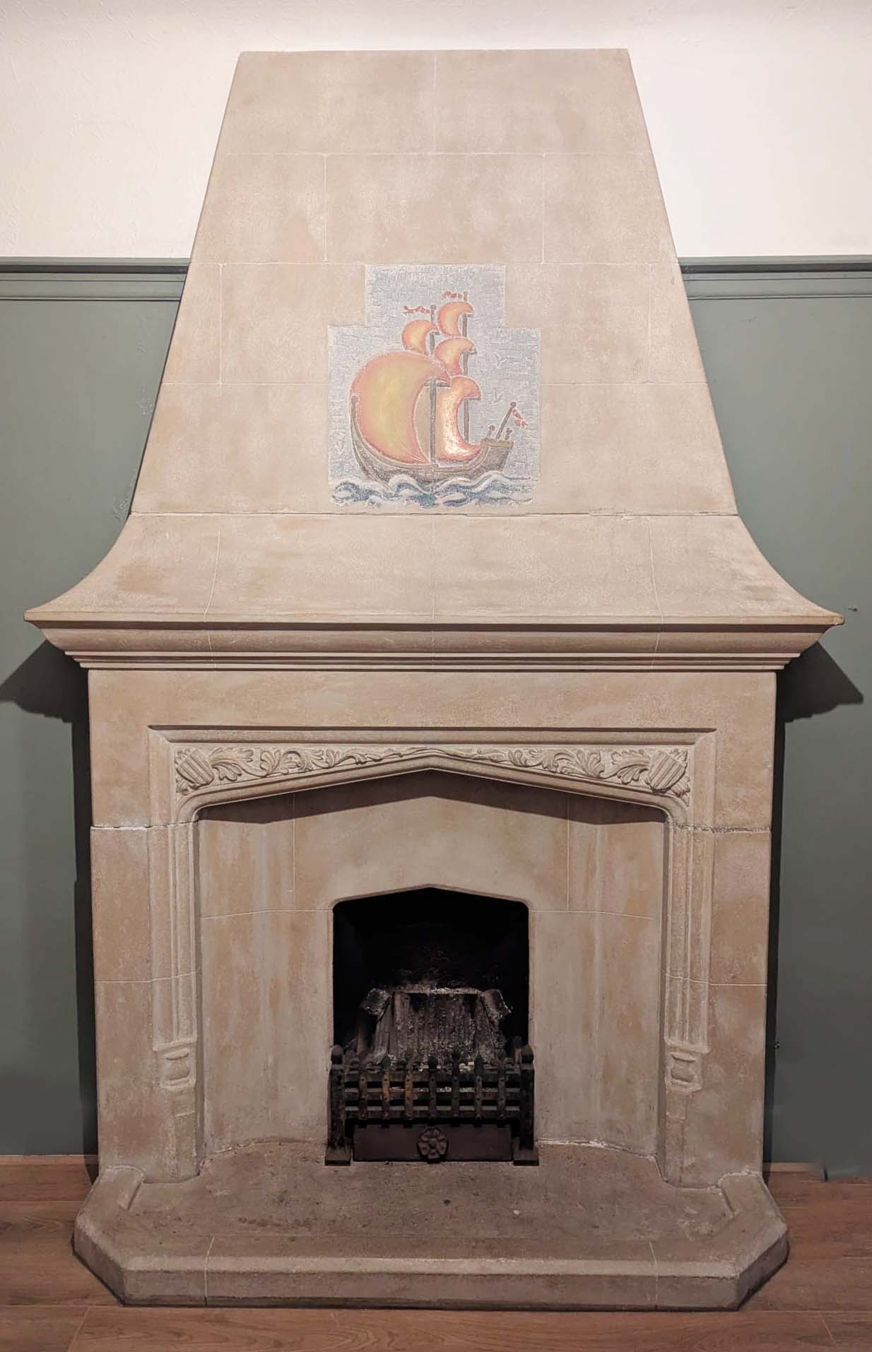 An early 20th century Arts and Crafts carved stone fireplace, the tapering overmantel carved with a reserve panel of a galleon, the surround with a carved foliate arch and moulded jambs, height 250cm, width 164m, depth 52cm. Note: this fireplace is thought to have originated from Warren Wood, Hayes Common, Bromley, a house built in 1873 and demolished circa 1936. It closely matches a similar fireplace still in situ at the nearby manor house, The Warren.