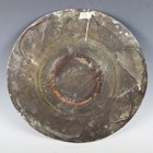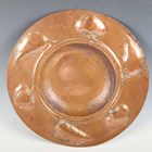An early 20th century Arts and Crafts copper charger, attributed to the Potteries Guild of Cripples, the raised border worked with a band of leaves and flower buds, diameter 40cm. Note: this charger can be seen in the Potteries Guild of Cripples showroom catalogue, No. 572, circa 1905.