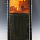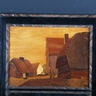 A Rowley Gallery rectangular marquetry panel wall mirror, the panel worked in a variety of woods with country cottages, the reverse bearing 'Rowley Gallery' label inscribed in pen 'Salcot', 62cm x 32cm.