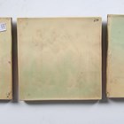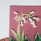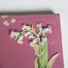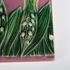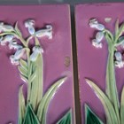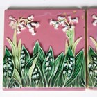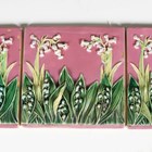 Three George Jones majolica tiles, circa 1870, moulded with bluebells and lily-of-the-valley against a pink ground, each with black painted numerals '1889' to reverse, 19.5cm x 19.5cm (some faults).