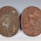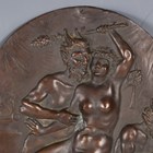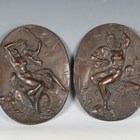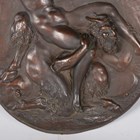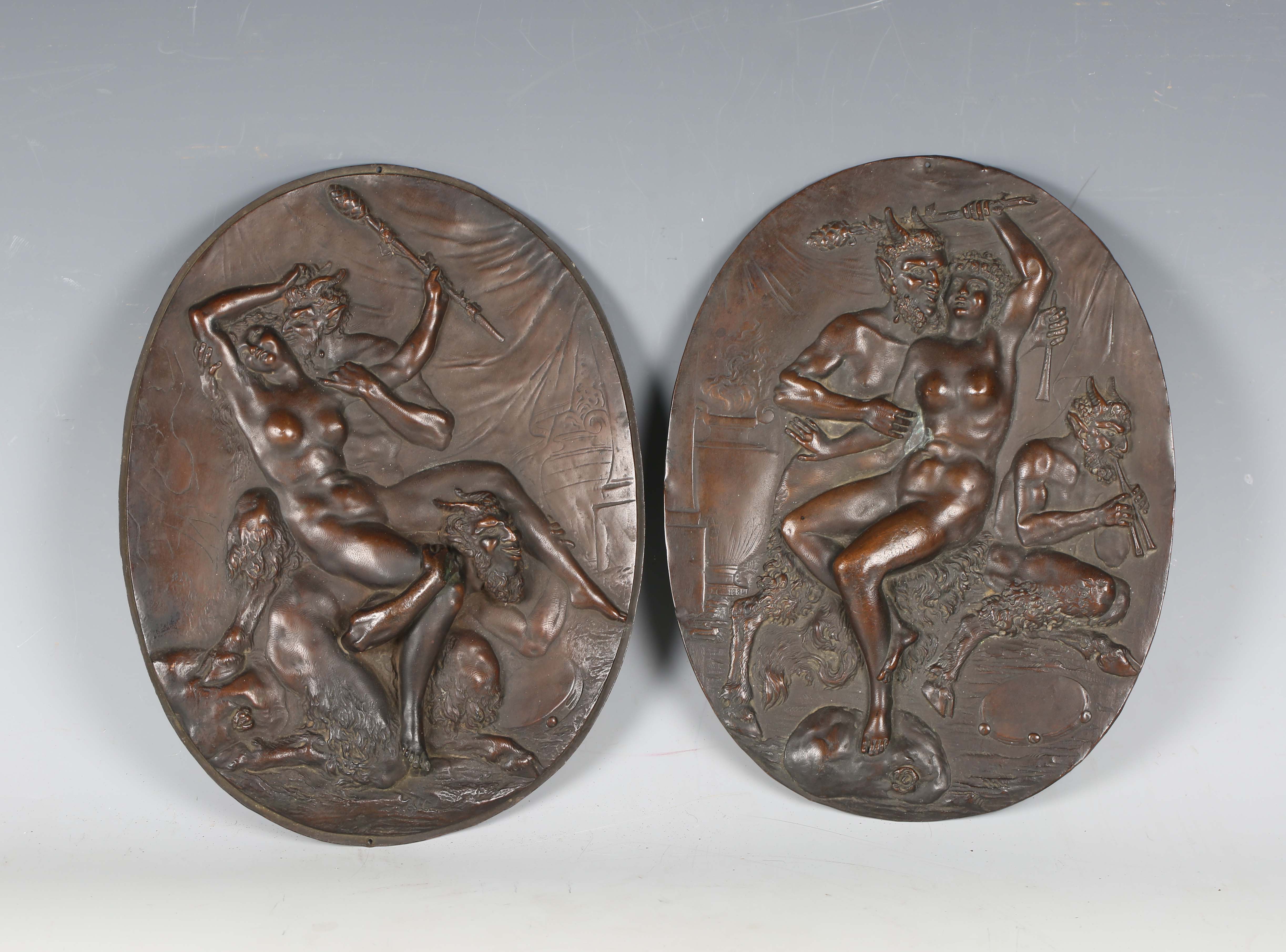 A pair of 19th century bronzed electrotype oval panels, in the manner of Clodion, each depicting a nymph and two male satyrs, finely cast in high relief, 26cm x 20cm.